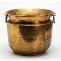 The fold over everted rim above a planished body, the opposing ring handles with copper rivets, on a plinth base