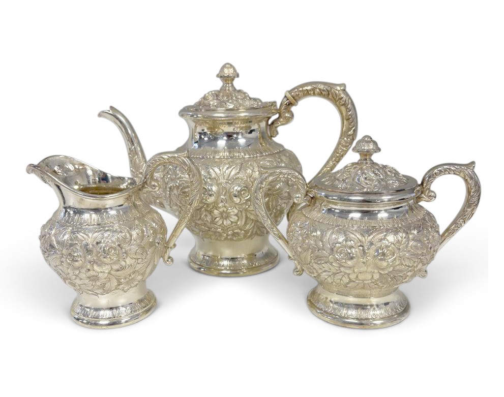 AN AMERICAN SILVER THREE-PIECE TEA SERVICE, S KIRK AND SONS