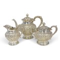 Comprising: a teapot, two-handled sugar basin and milk jug, the teapot with hinged dome cover and bud finial, the body embossed with leaves and flowerheads, applied leaf-capped handle, raised on a circular foot, the sugar basin with detachable cover and bud finial, the body with applied opposing leaf-capped handles, raised on a circular foot