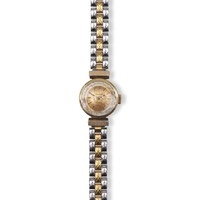 The 20mm circular silvered dial with baton hour markers, date aperture at 3 o clock, gold plated case and flexi strap, service required, sold as is