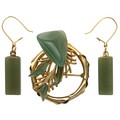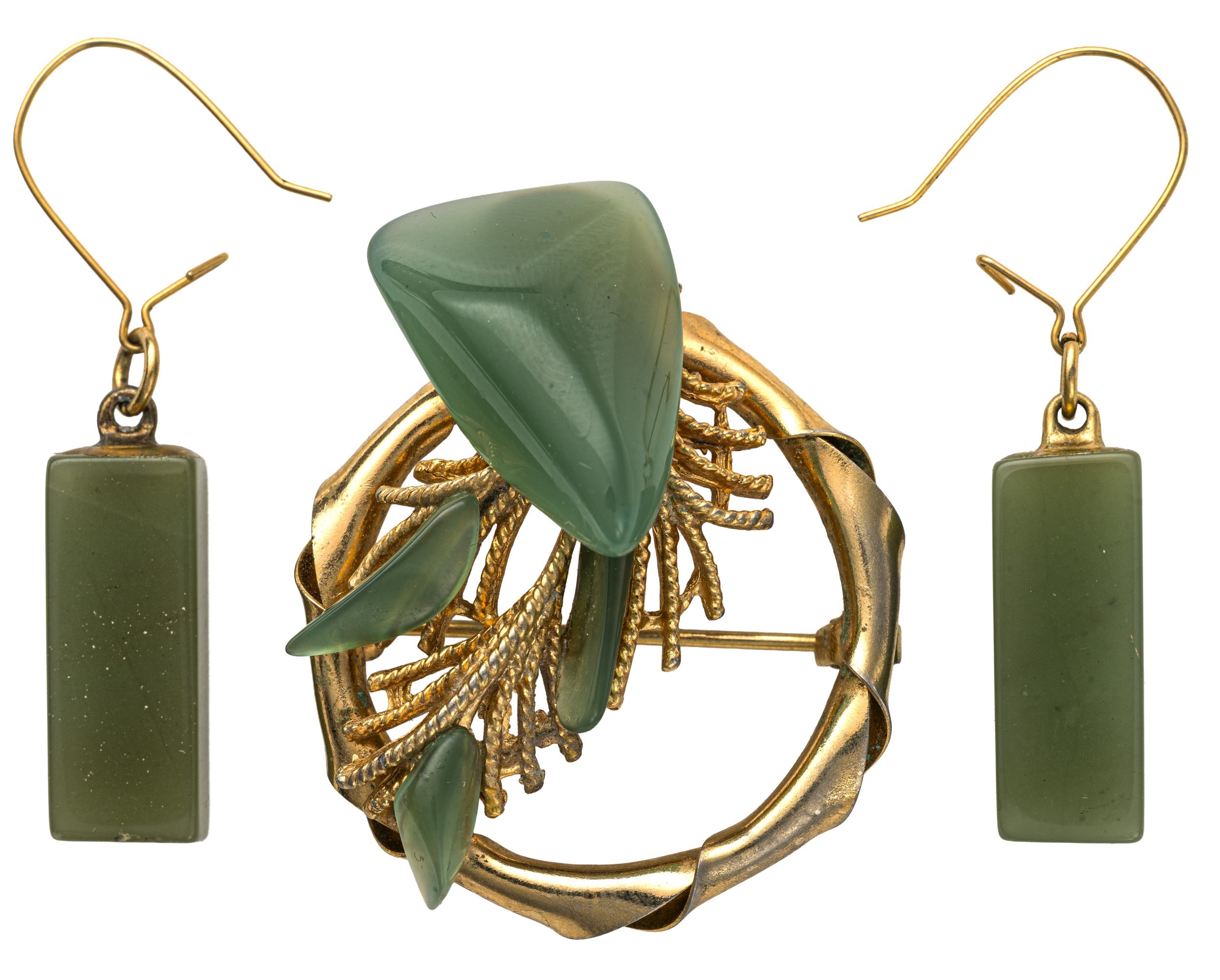 The 25mm circular brooch with jade-like insert, the matching rectangular drop earrings 4cm long