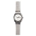 The circular 32mm white dial with baton hour markers, day-date aperture at 3 o clock, sweeping seconds hand, stainless-steel strap with a fold over clasp