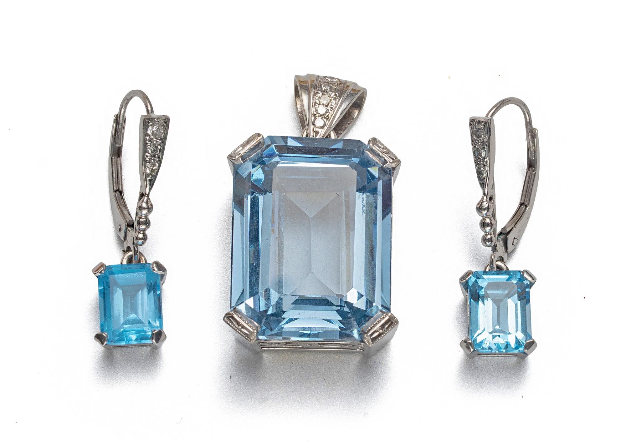Manufactured by Mark Van Der Walt, claw set to the centre the emerald cut topaz weighing approximately 20 carats, in a 9ct white gold pendant with a V hook, pave set with three round brilliant-cut diamonds weighing 0.20 carats, colour G, clarity VS, with matching earrings, claw set with two emerald cut topaz, weighing 4 carats and pave set with 0.20 carats of round brilliant-cut diamonds, in 9ct gold, 13,5g all in