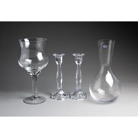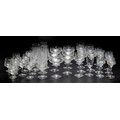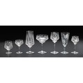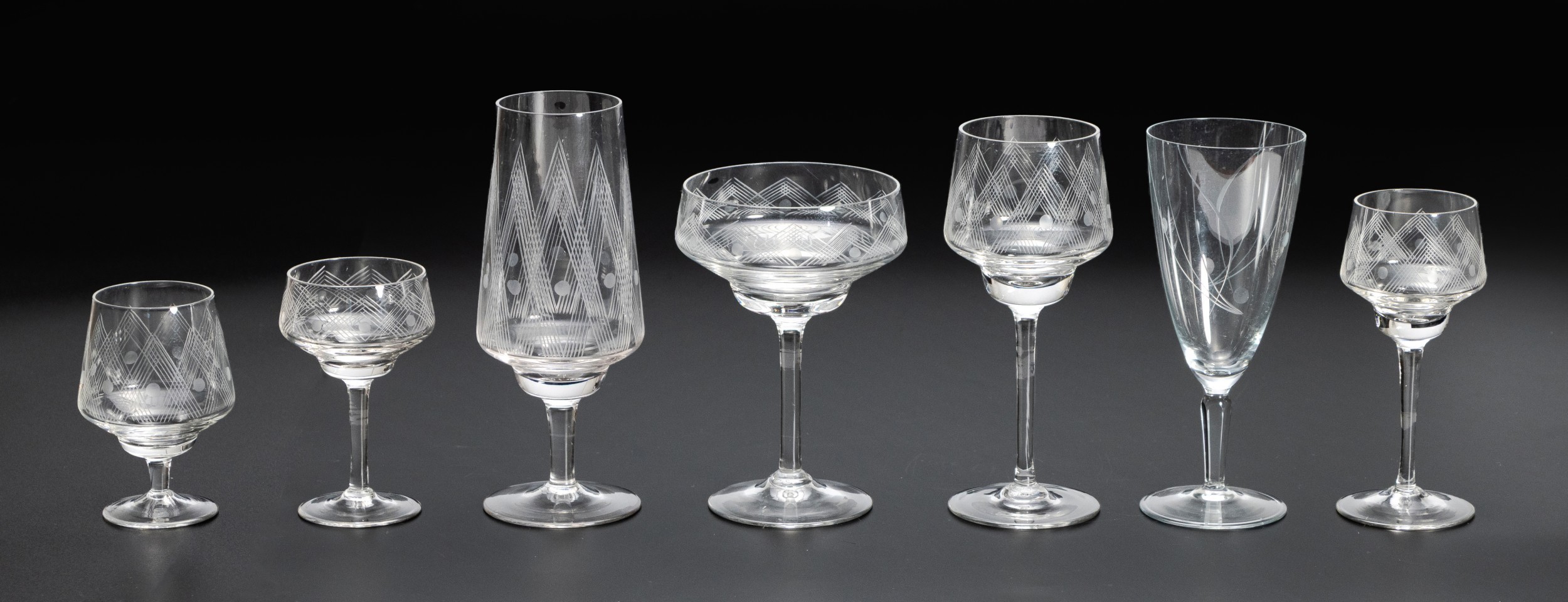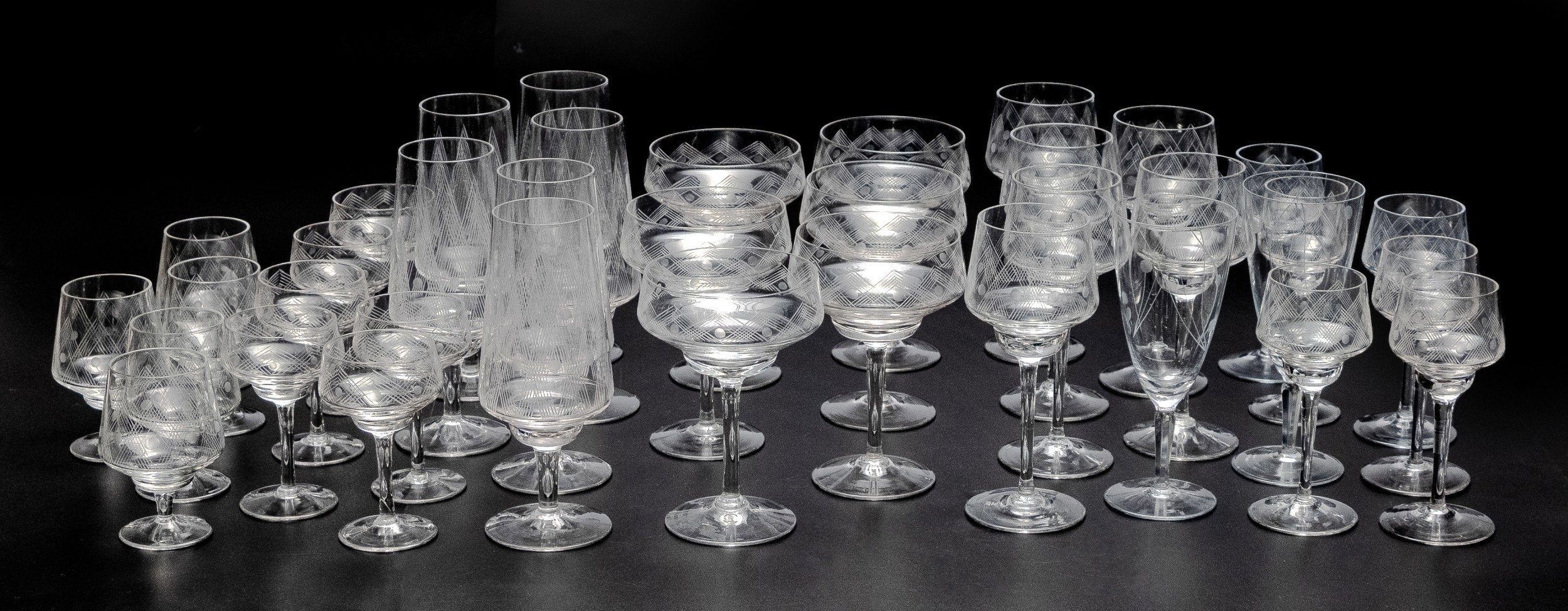 Comprising: six tall goblets, two champagne flutes, six wine glasses, six coupe glasses, six dessert wine glasses, six cordial glasses, and five sherry glasses, each etched with fine geometric details