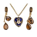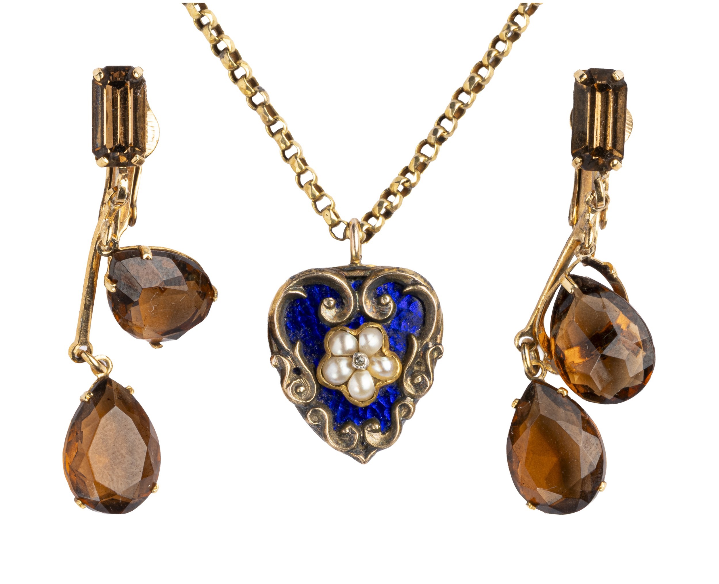 Comprising an enameled pearl heart pendant, length 2cm, on a rolled gold chain, length 43cm and pair of gem set rolled gold earrings, length 5cm