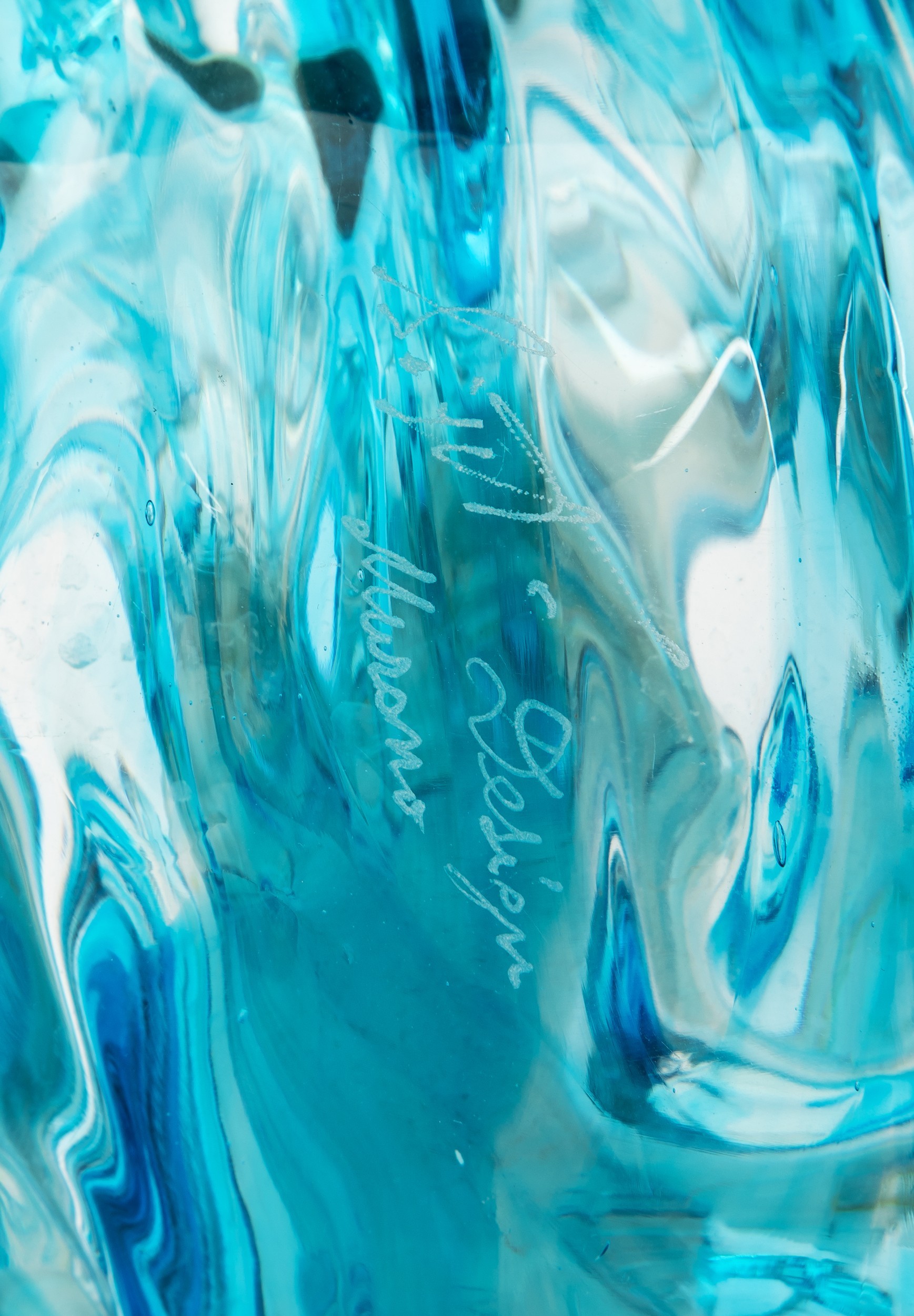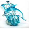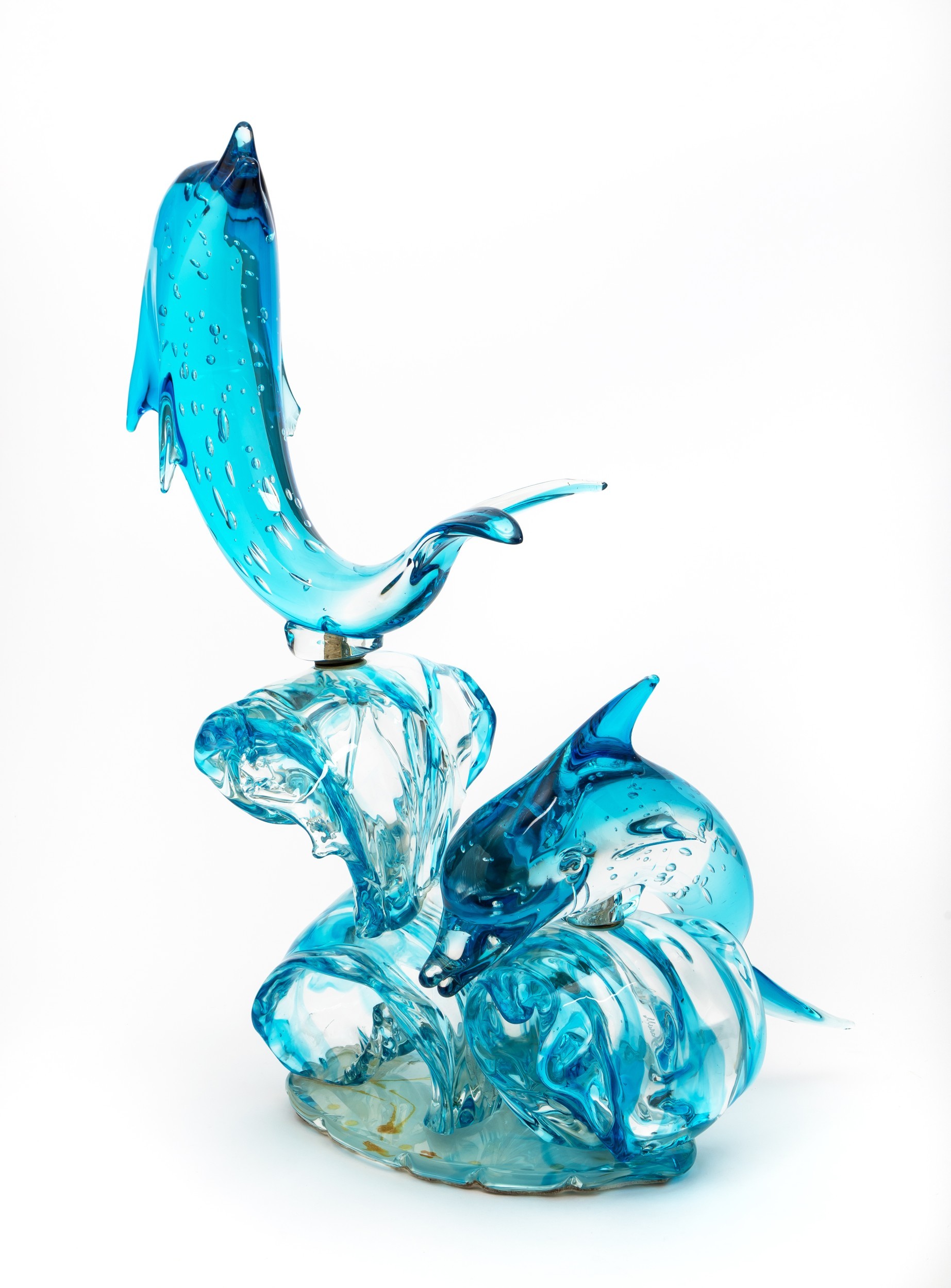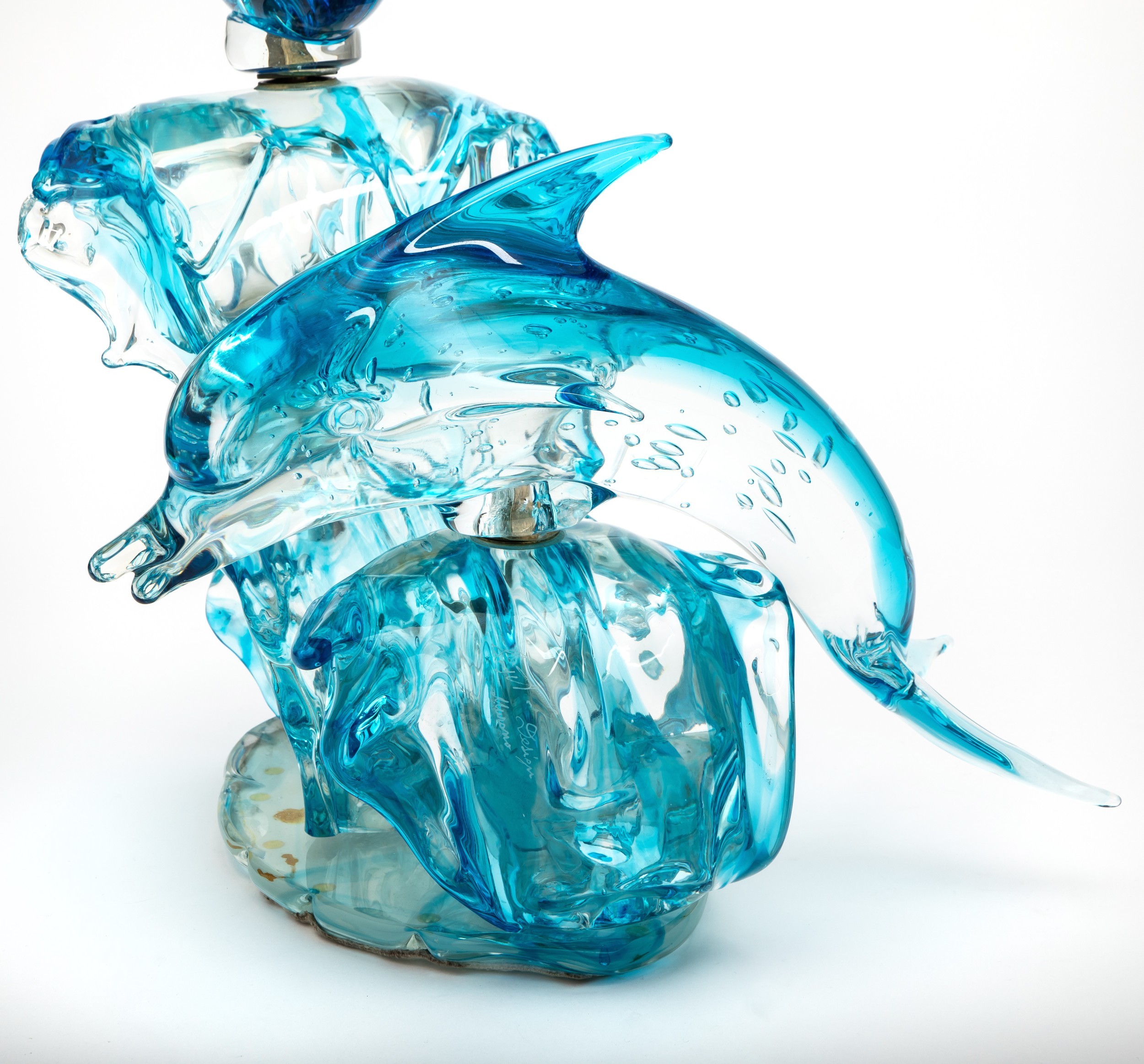 Two Dolphins riding the waves in graduating shades of blue to clear glass, Signed, Sipuonetti Design, Murano,