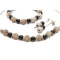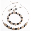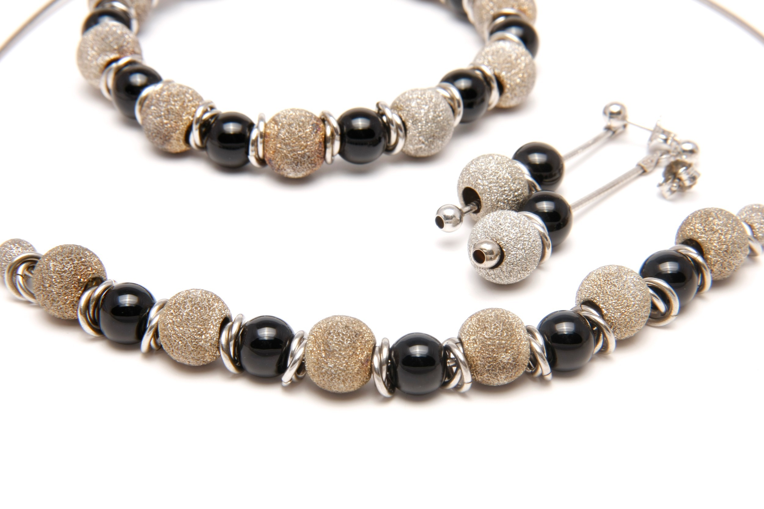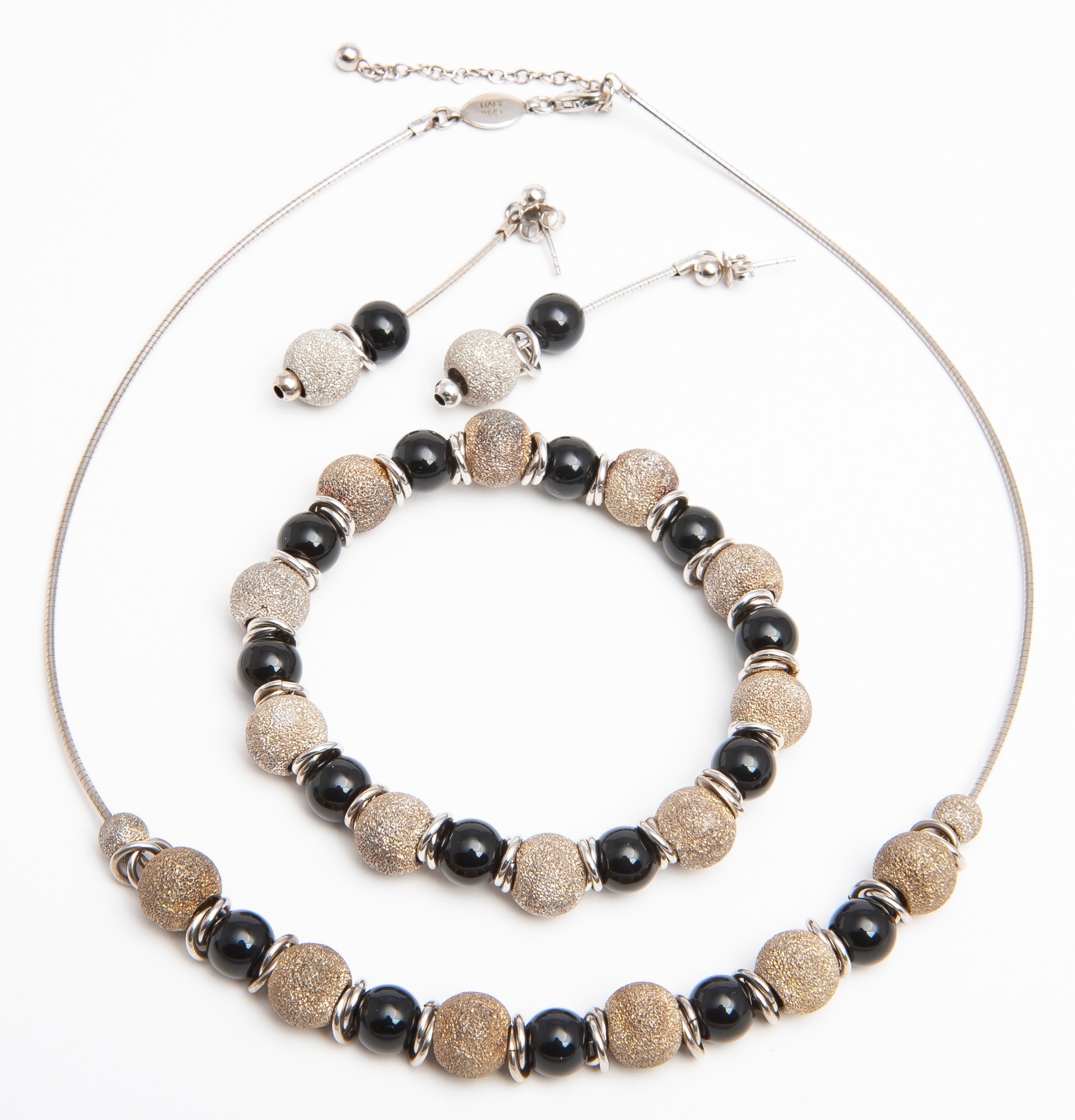 Comprising a pair of earrings, a bracelet and a necklace, each made up of alternating black and silver beads on a silver wire chain