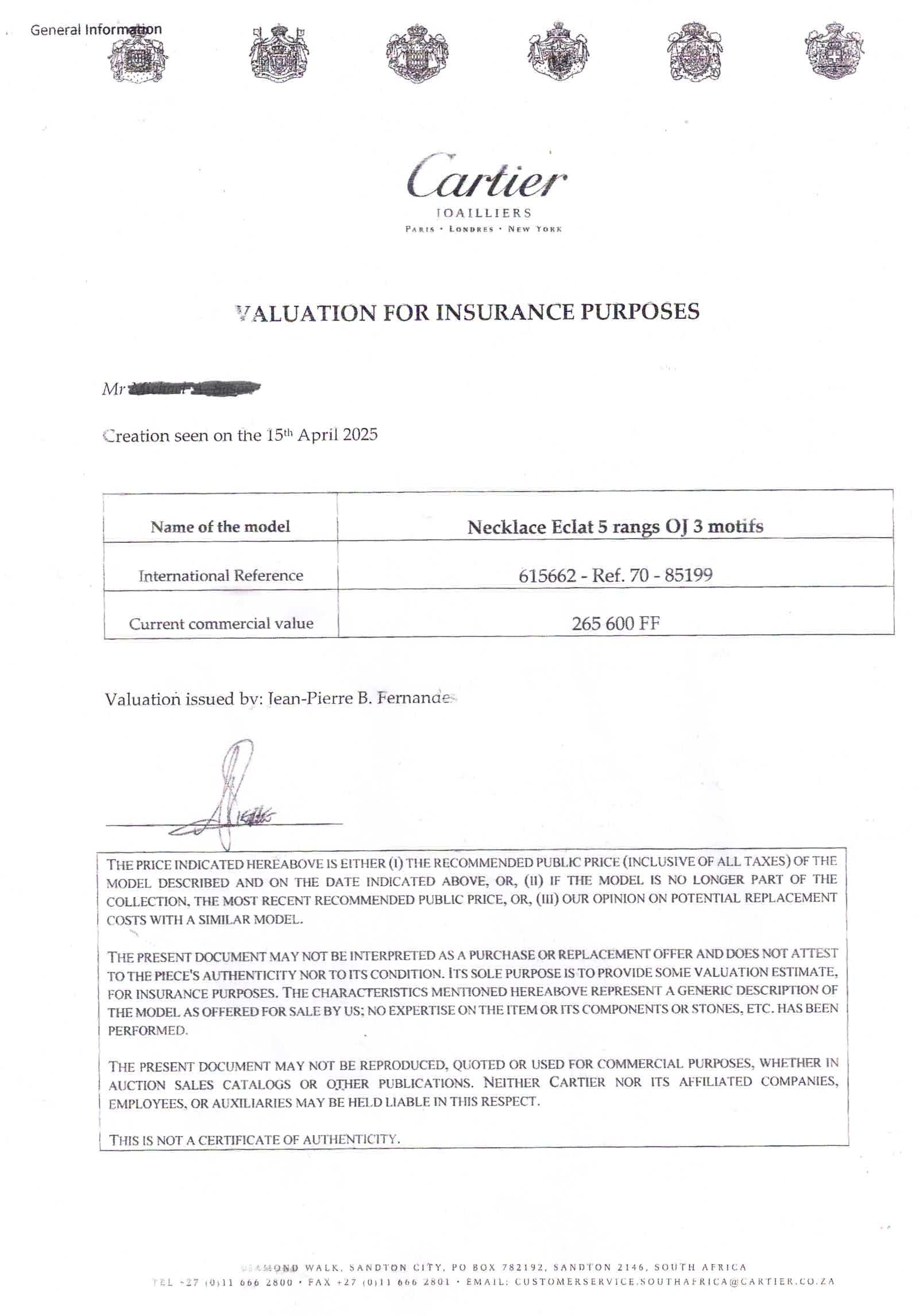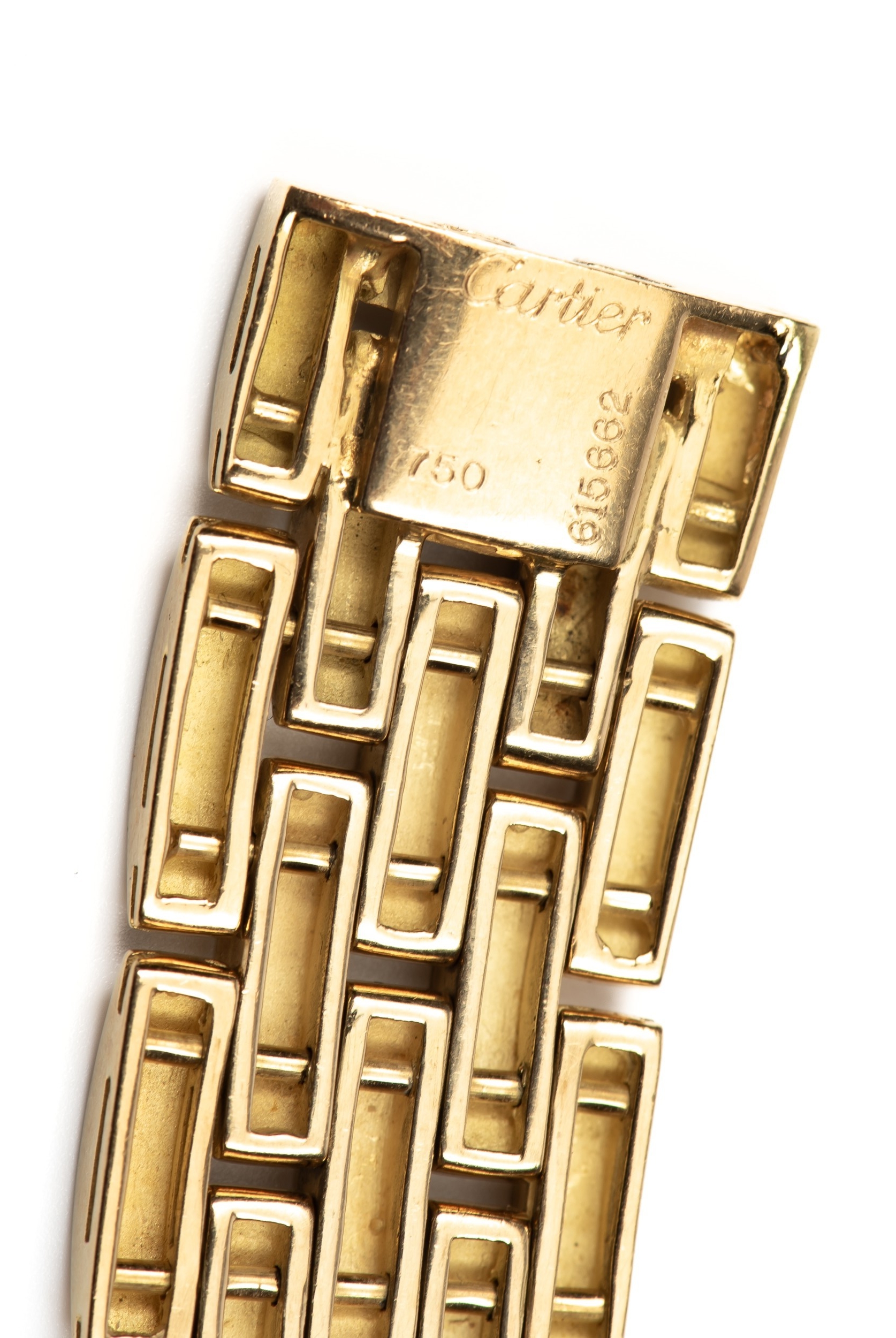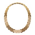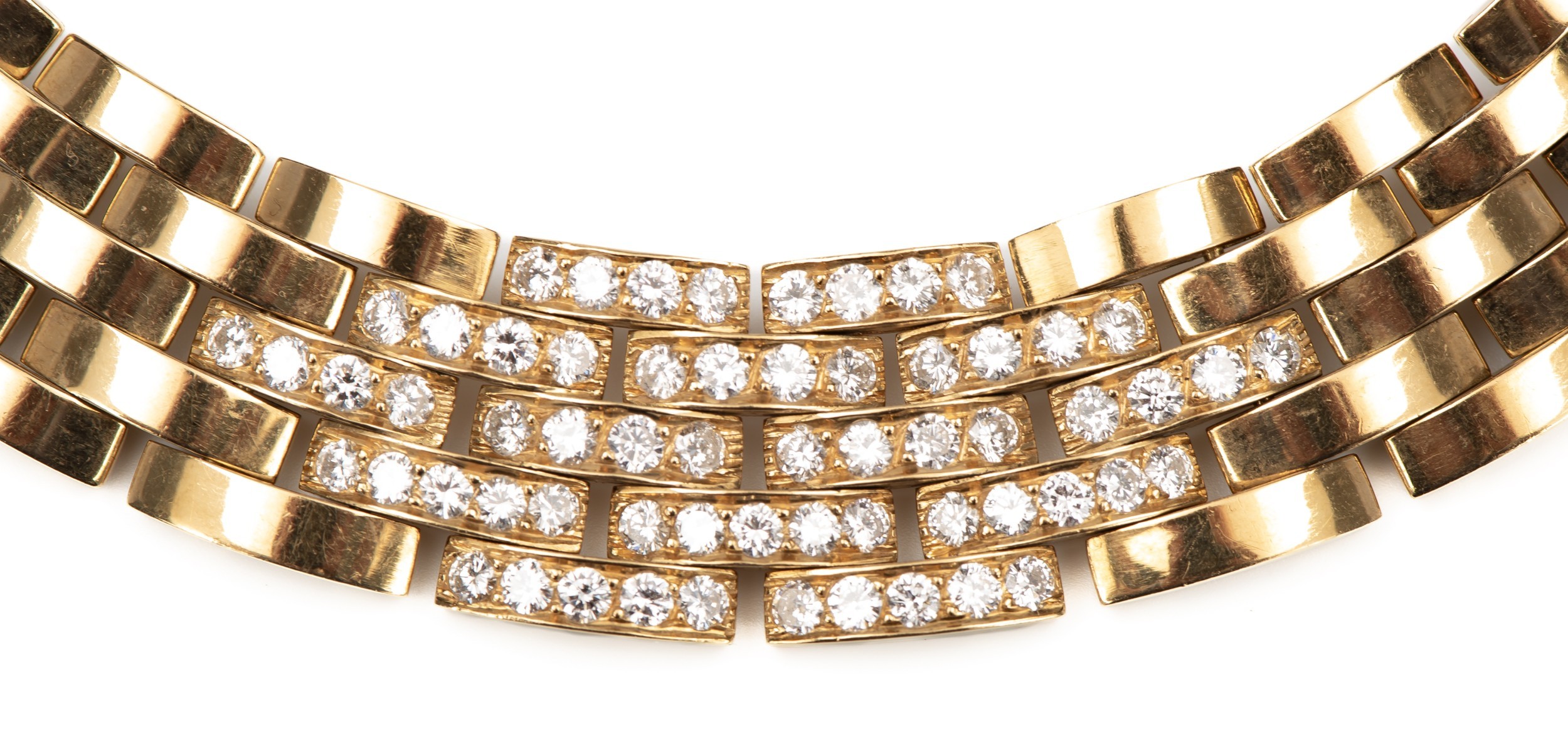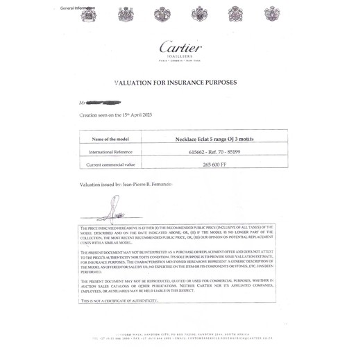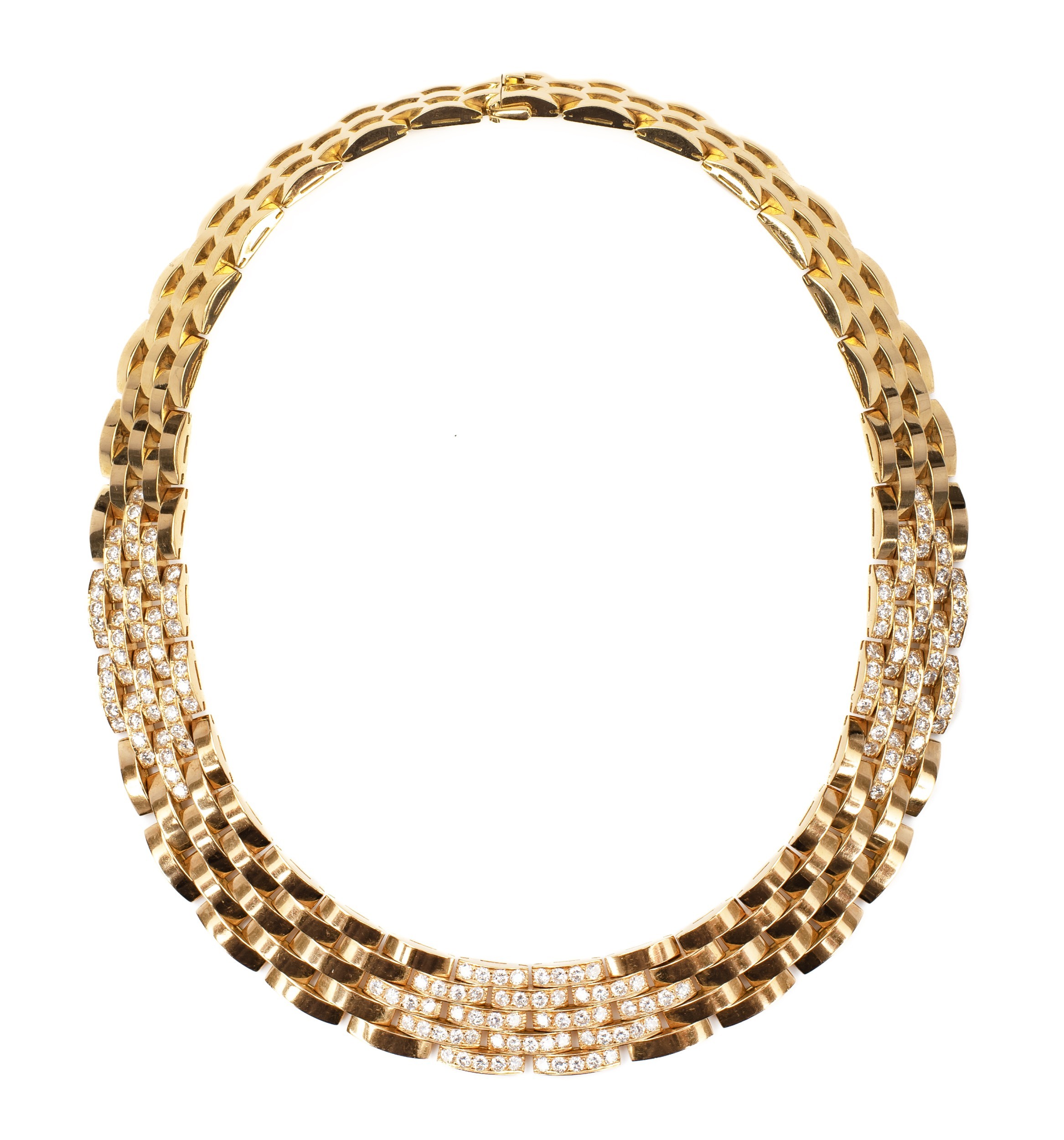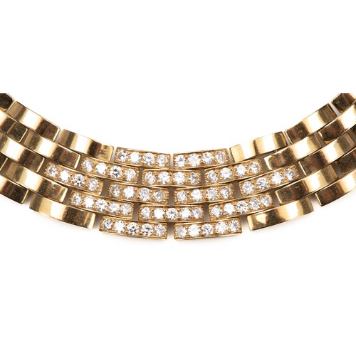International reference number 615662, Ref .70- 85199, a series of five row interlocking rectangular links 8mm wide, pave set with 12 carats of round brilliant cut diamonds, colour E-F, clarity VVSI, 43cm in length with a box clasp, 145g all in, accompanied by a Cartier valuation for insurance in French Francs confirming the original price paid in 1980 for FF265.600.00