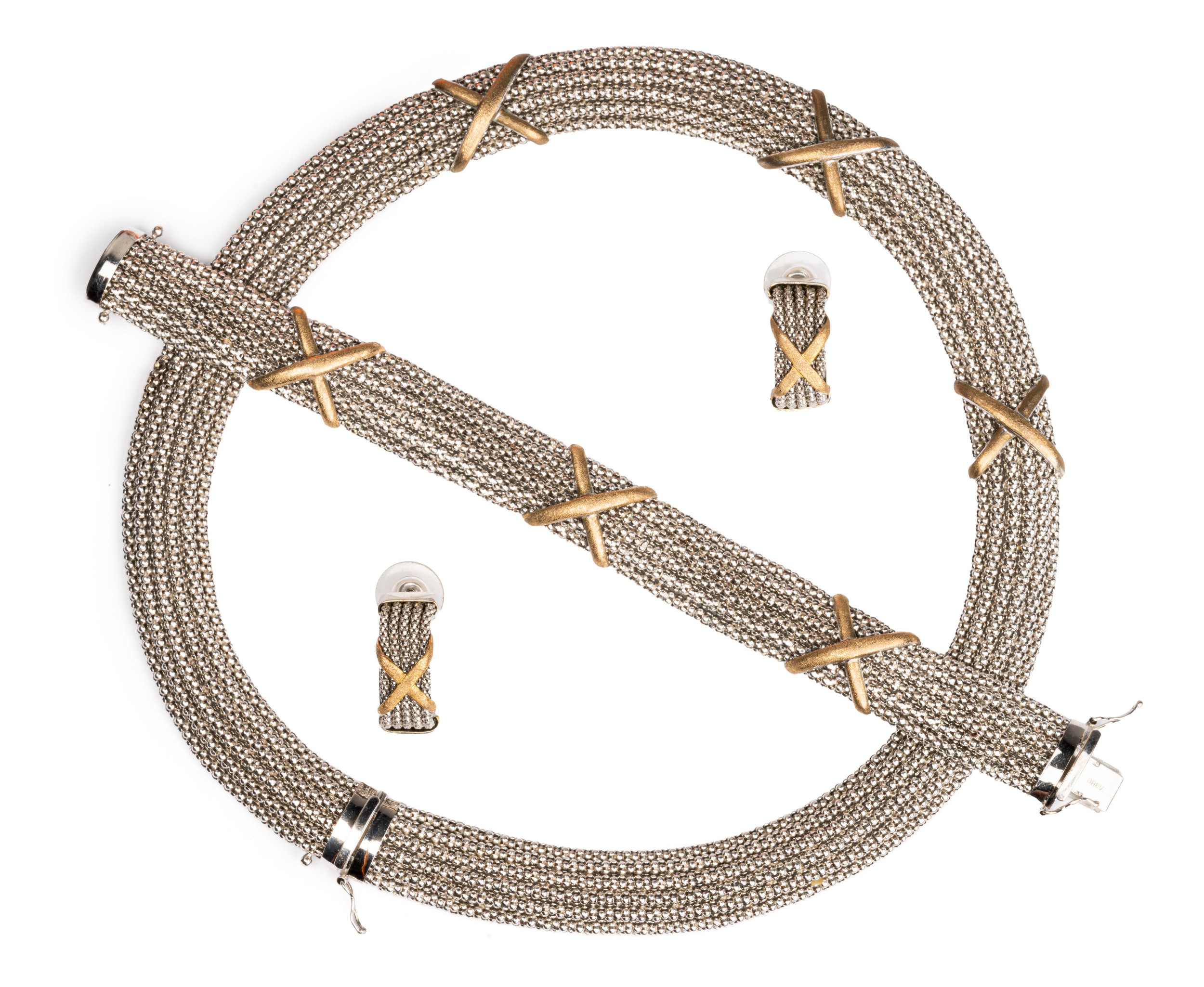 The popcorn link silver chain 18mm wide, with gold X-shaped accents, length 43cm, with a matching bracelet, length 18,5cm and earrings with pins and stabilizers, 69,8g