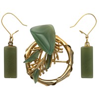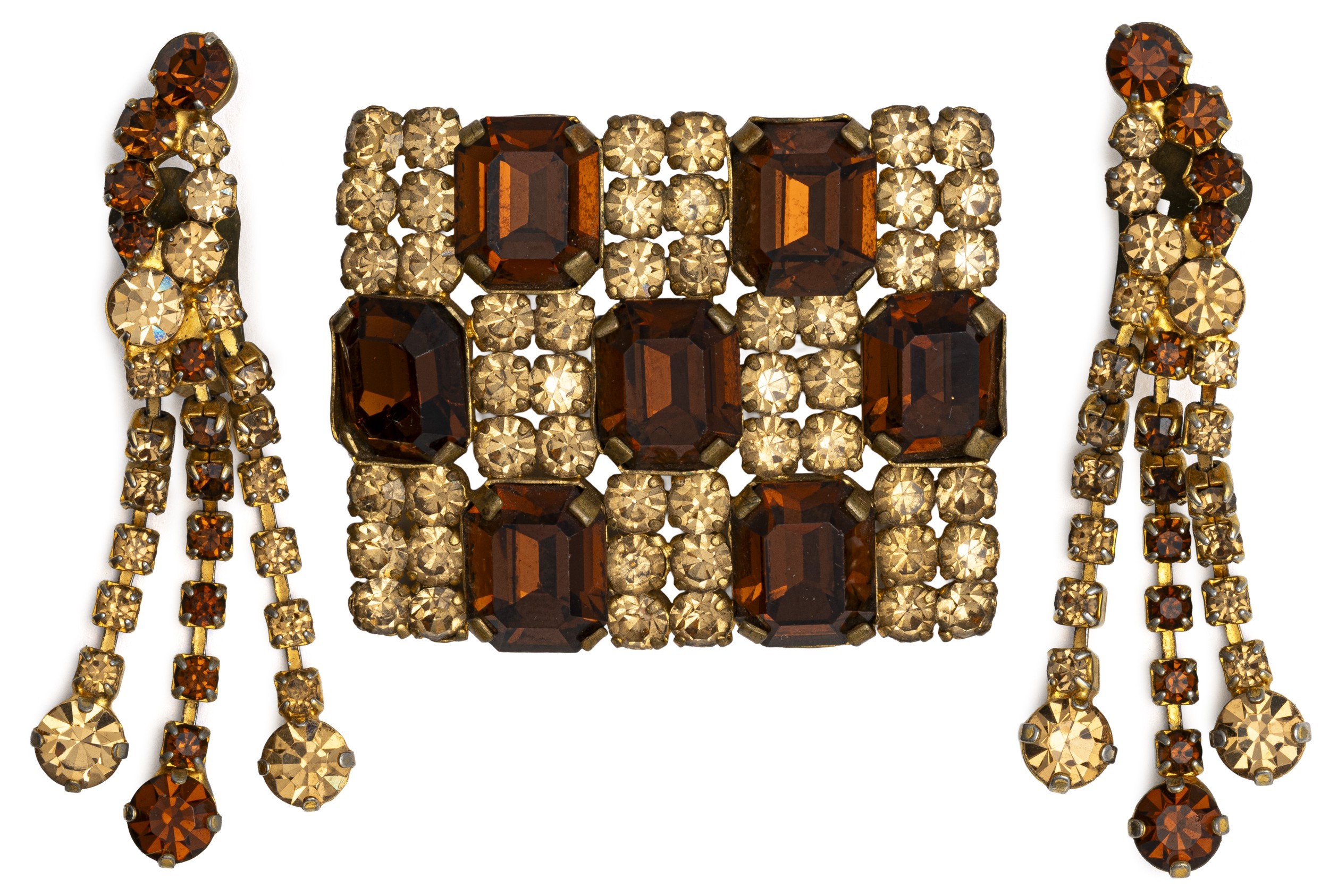 The rolled gold chandelier style earrings with claw set bronze gemstones 6cm long, with clip on fittings, the matching checkerboard style brooch 5cm wide