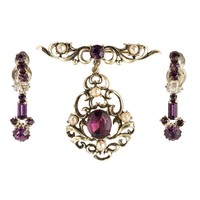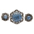 Bezel set to the centre, circular bluish cabochon gemstones, the brooch 4cm in length, 25g all in