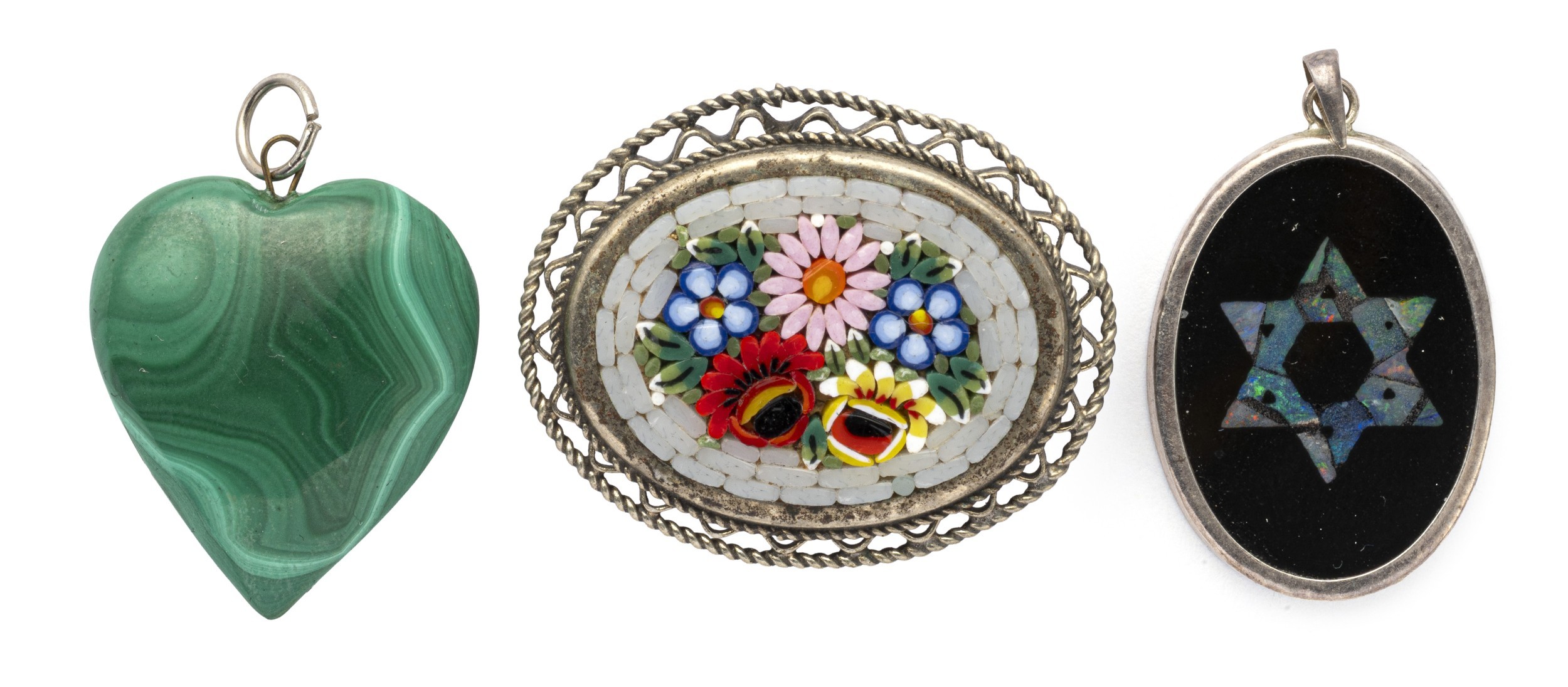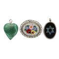 Including an oval floral brooch length 3cm, a silver pendant and a malachite heart pendant
