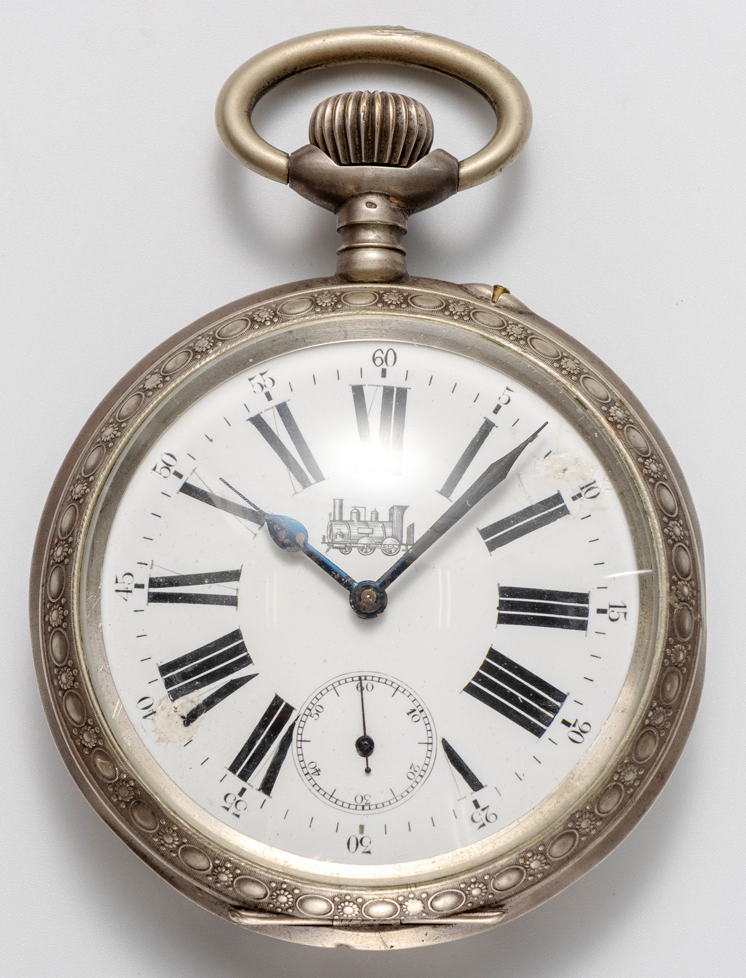 The circular 58mm white dial with Roman numeral hour markers, calibrated outer ring, subsidiary seconds dial, chased case 7mm thick, 256g all in