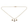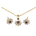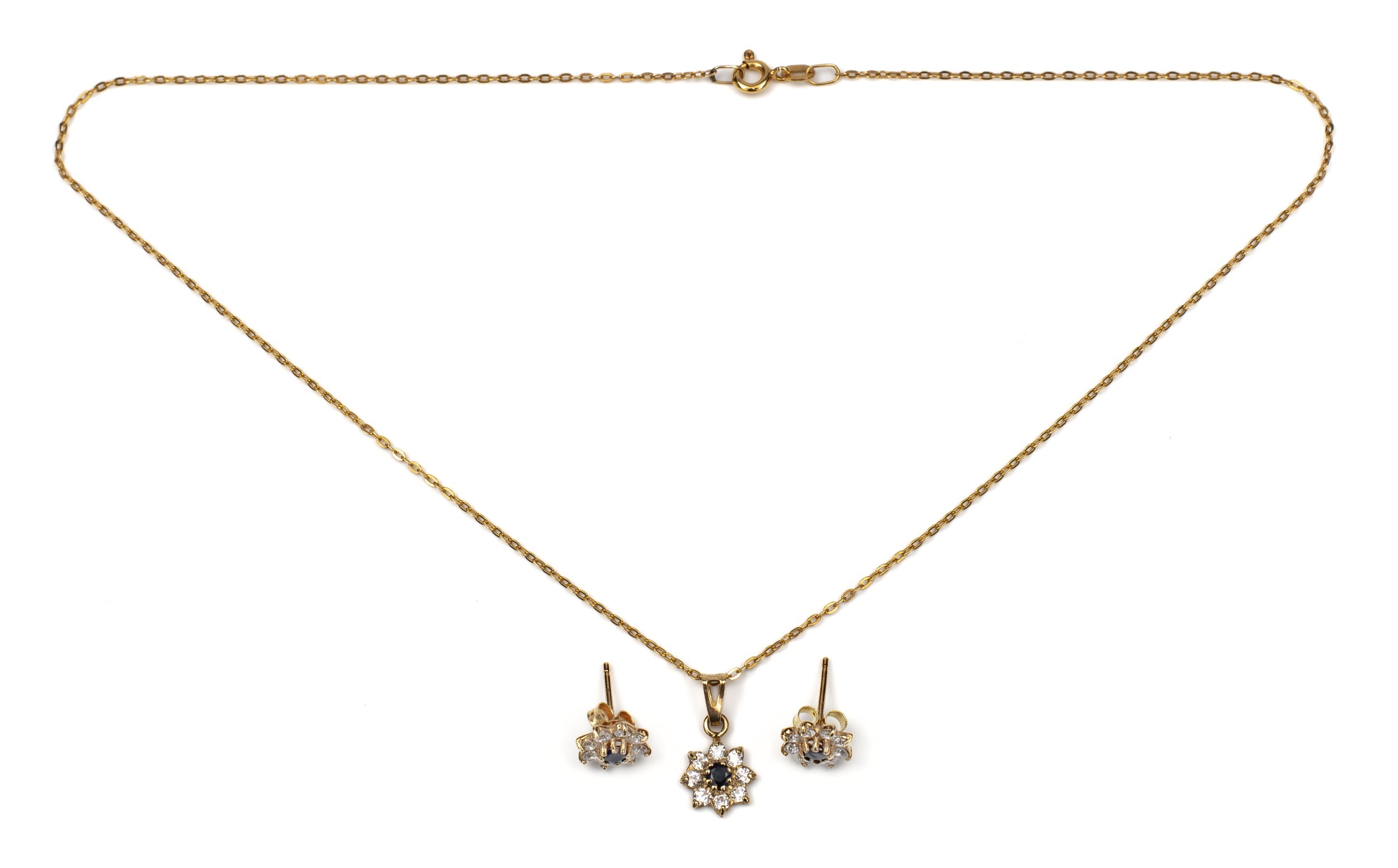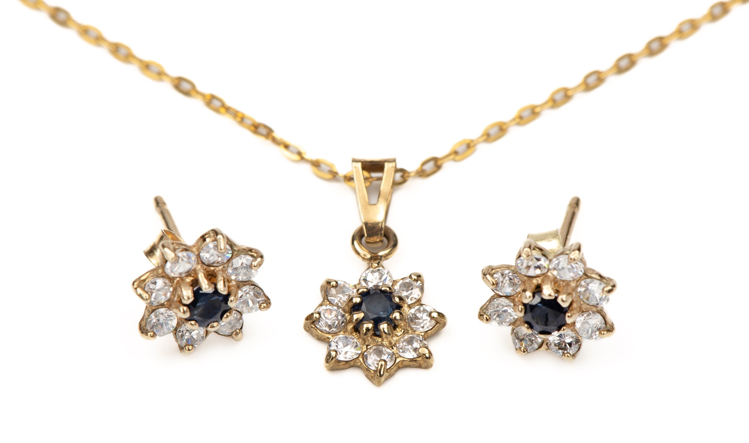 The earrings claw set to the centre with created sapphires surrounded by Swarovski style crystals with a matching pendant and 9ct gold chain, the chain 43cm long, 4g all in