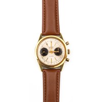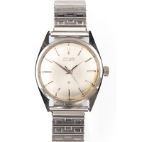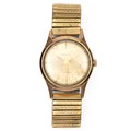 The circular 28mm silvered dial with baton hour markers, calibrated outer ring, rolled gold case and flexi strap