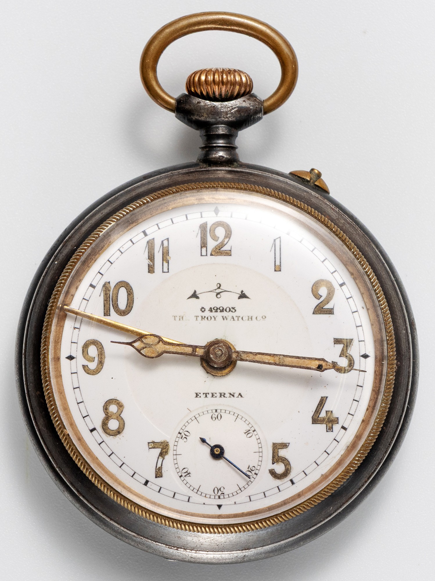 The white enamel dial with Arabic numeral hour markers, dial diameter 45mm, calibrated outer ring and subsidiary seconds dial with alarm function