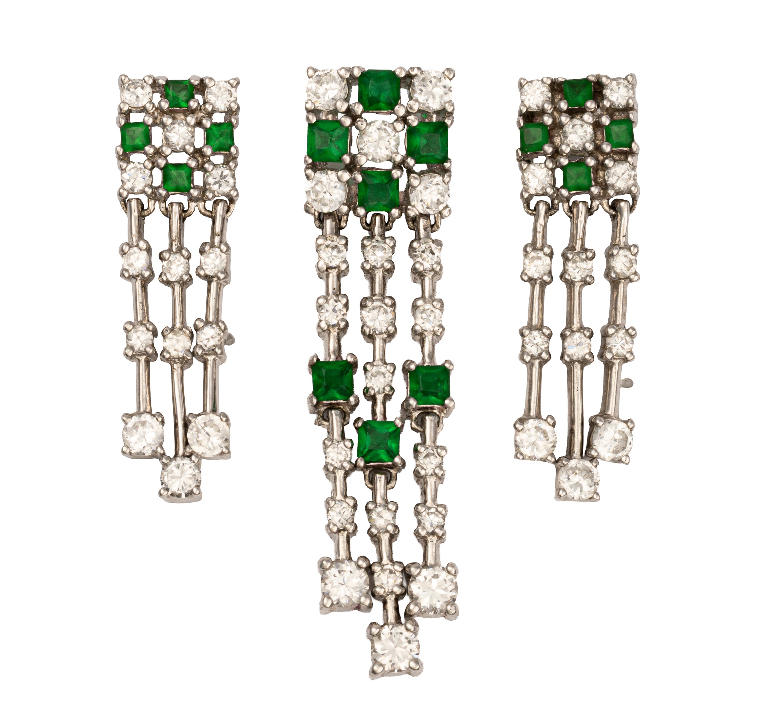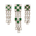 Waterfall checkerboard design, the 18ct white gold pendant set with 1.01 carats of round brilliant-cut diamonds, colour G, clarity VS, separated by 7 round brilliant-cut emeralds with a combined weight of 0.45 carats, length 4,5cm , the matching earrings set with 0.70 carats of round brilliant-cut diamonds, colour G, clarity VS, with 8 round brilliant-cut emeralds weighing 0.25 carats, in a pair of matching 18ct white gold earrings, length 3cm, 12,7g all in