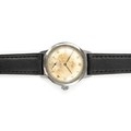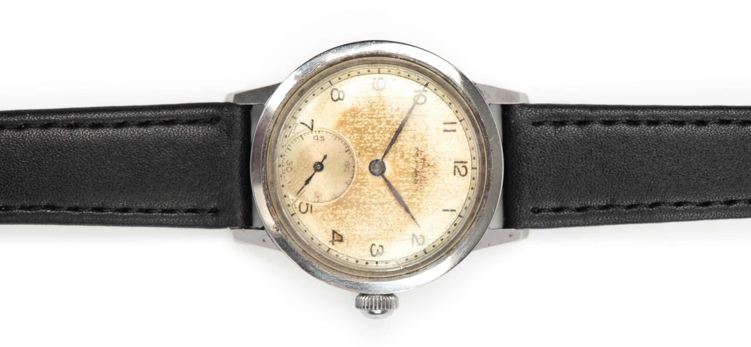 The 28mm faded round dial with Arabic hour markers, inner subsidiary dial, stainless steel case with a leather strap