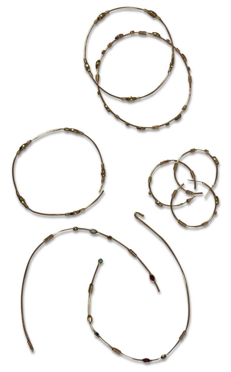 The 3mm round 9ct gold wire set with alternating gemstones, including a collar necklace, a pair of earrings, internal diameter 3cm, a pair of earrings, internal diameter 10cm and a bangle, internal diameter 58cm, with an odd near matching earring, 23g all in