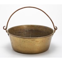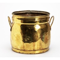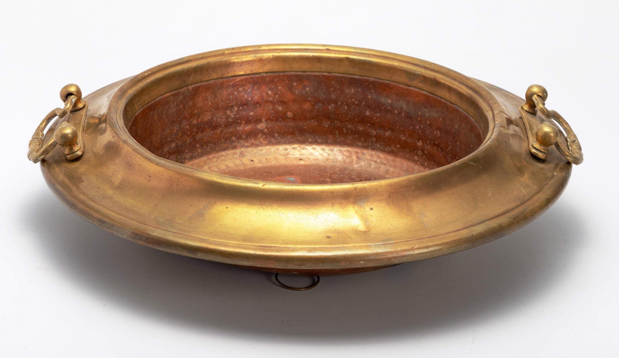 The brass rim with dolphin-shaped opposing handles above a planished body