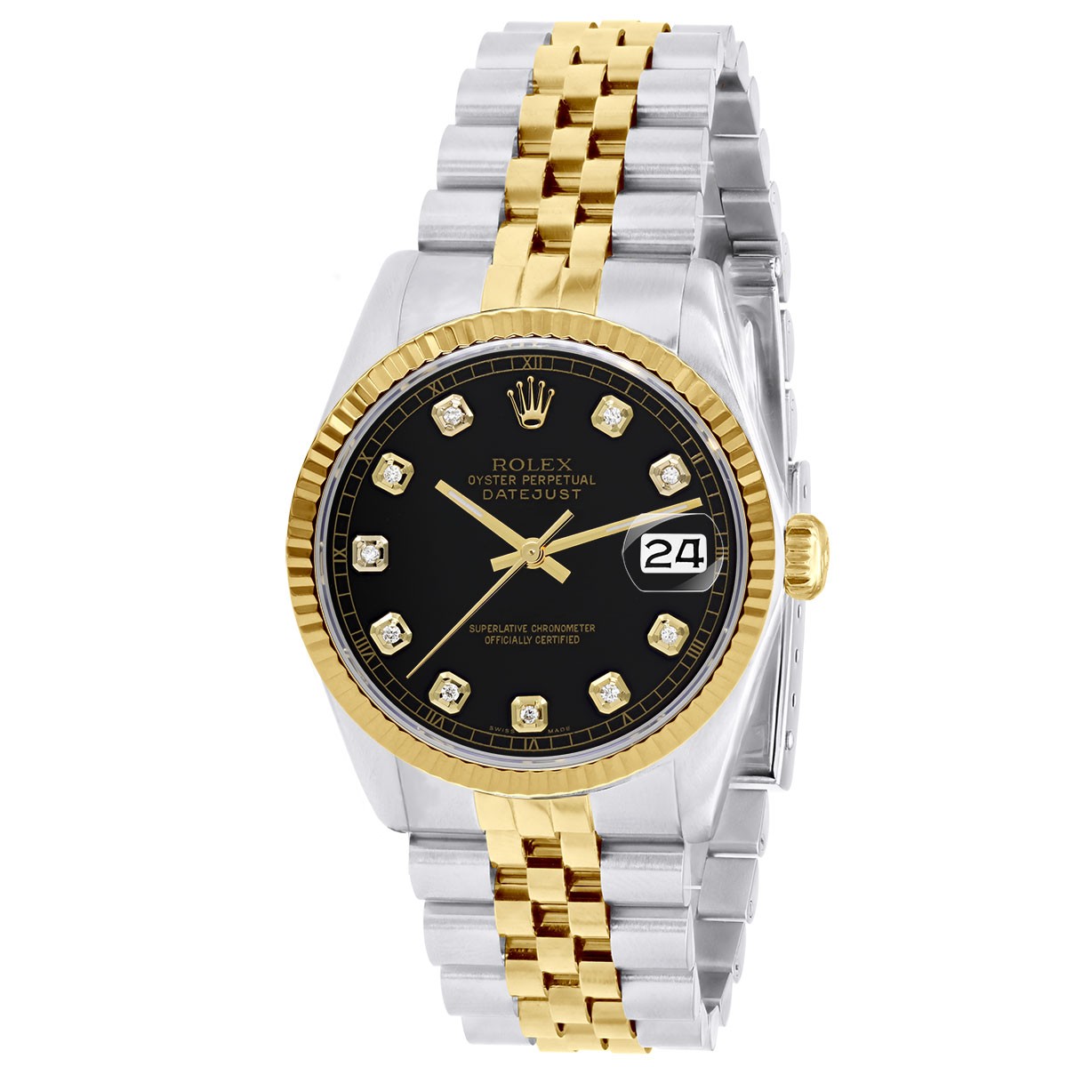Reference number 116233, The 36mm champagne dial with diamond hour markers, fluted bezel, sweeping seconds hand, date aperture at 3 o' clock, on a stainless-steel and gold strap with fold over clasp