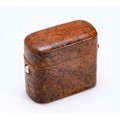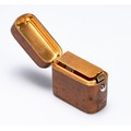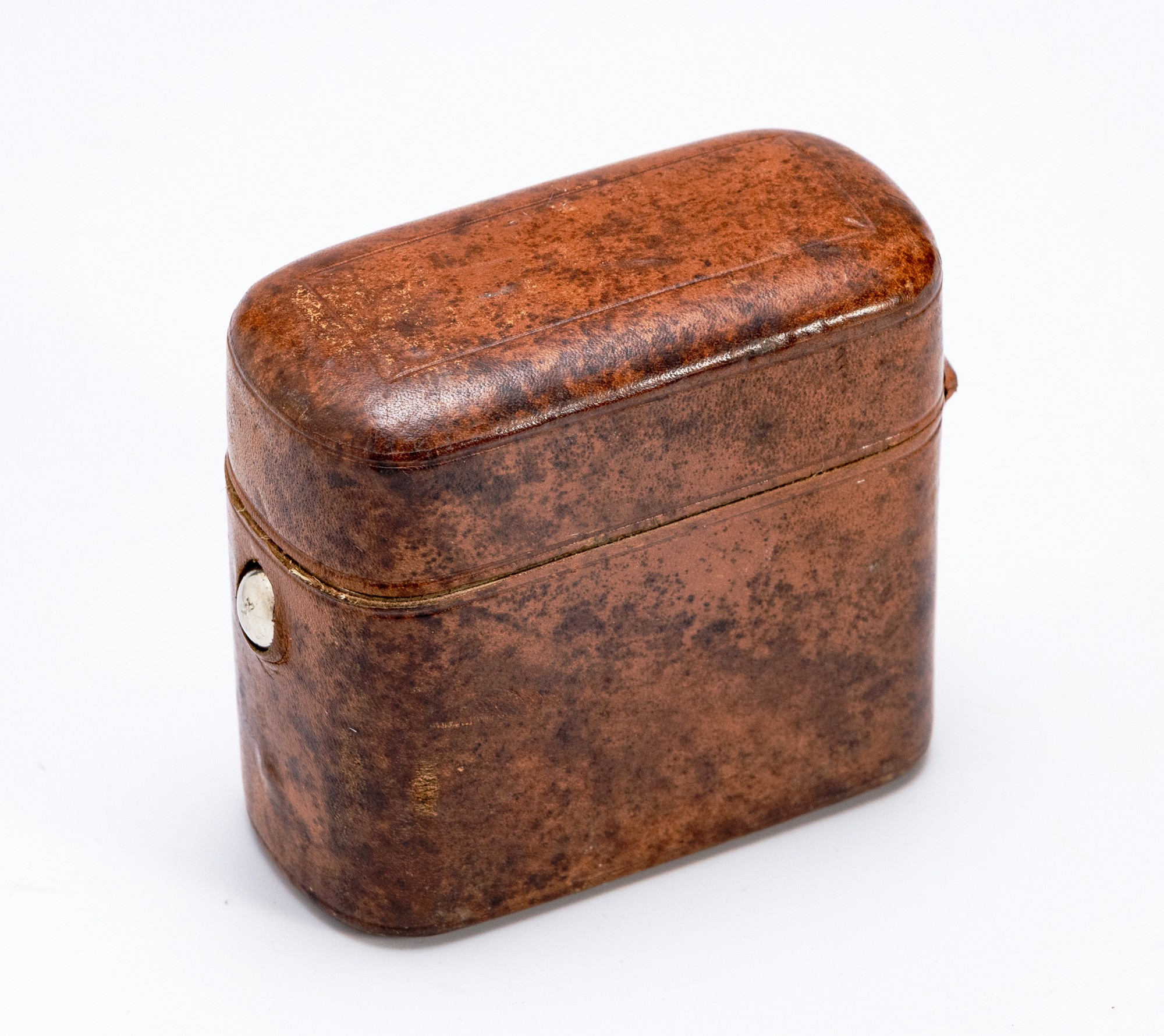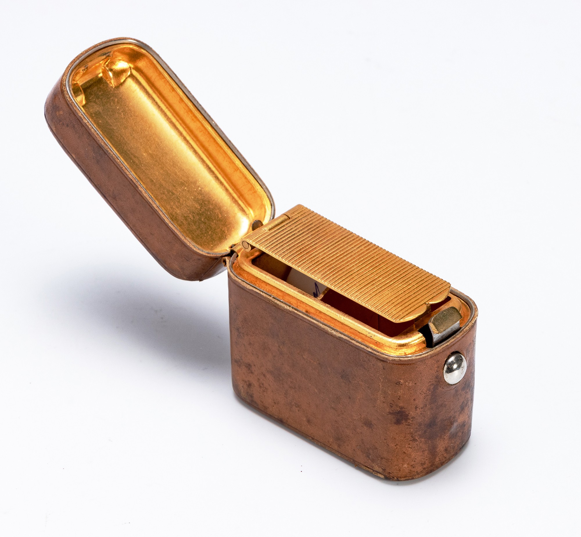 Rectangular, the hinged cover enclosing two compartments below a hinged striking surface