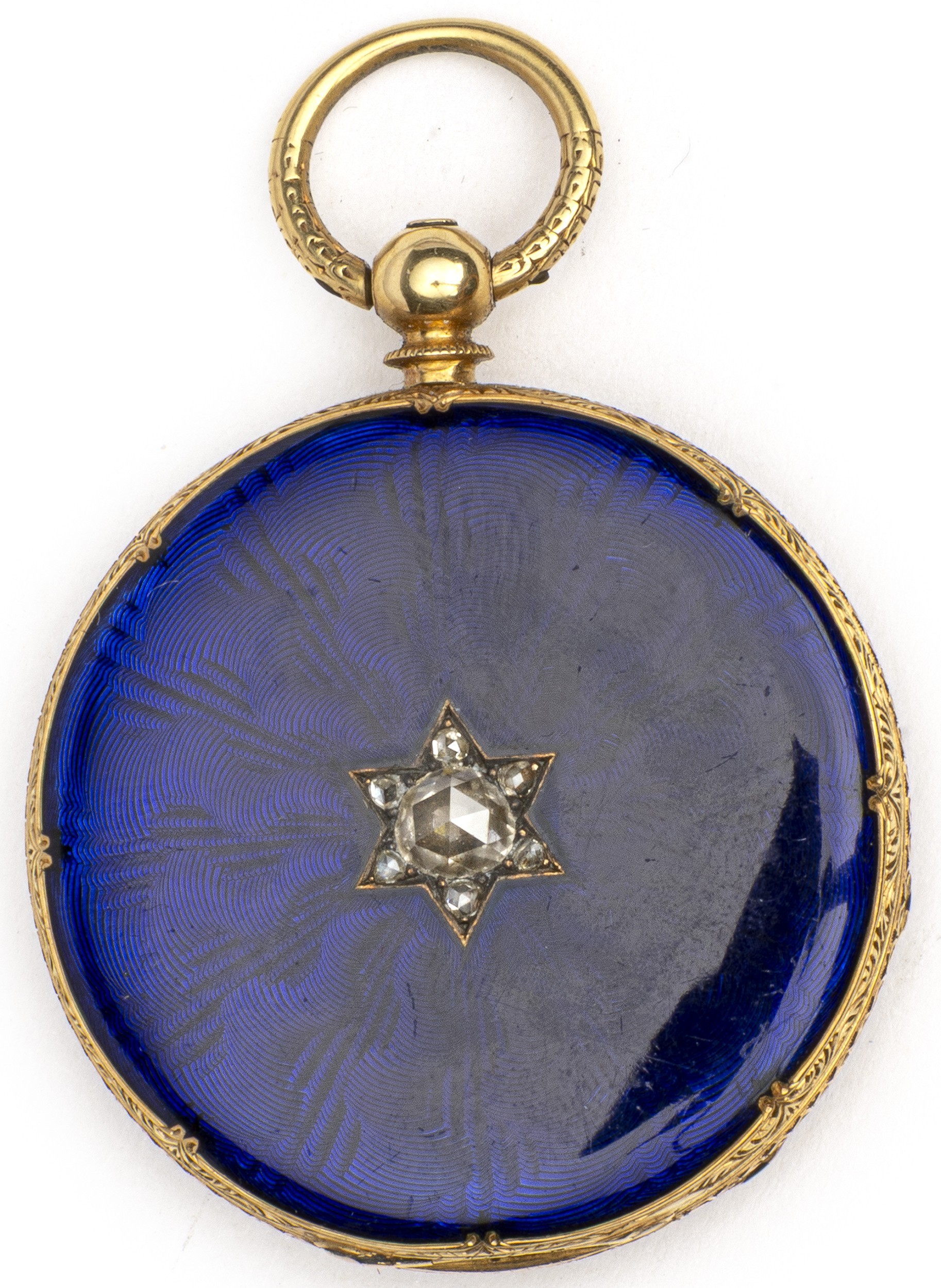 The circular 30mm dial with Roman numeral hour markers, calibrated outer ring, the case engine turned, the back, star set mine cut diamond to the centre, weight 0.35 carats, colour I, clarity SI, blue enamel case back, acid tested as 14ct gold, 27g in total