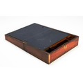 Rectangular, the hinged cover centred with a vacant brass cartouche, the interior with a leather writing surface and compartment divided into three sections, distress