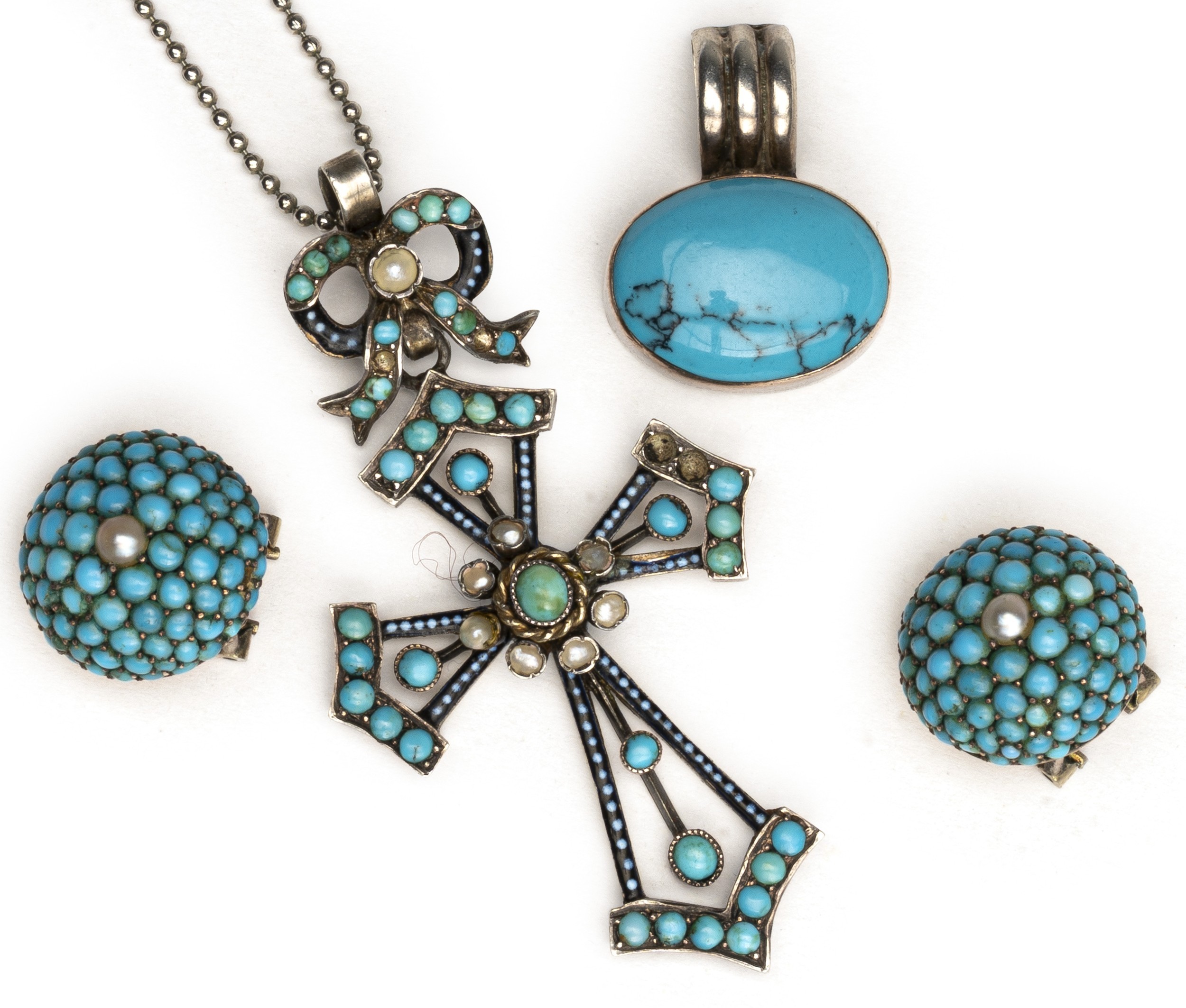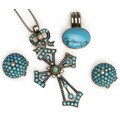 Comprising: a cross pendant and chain, an oval pendant and a pair of bombe style earrings, set with turquoise, 31g all in