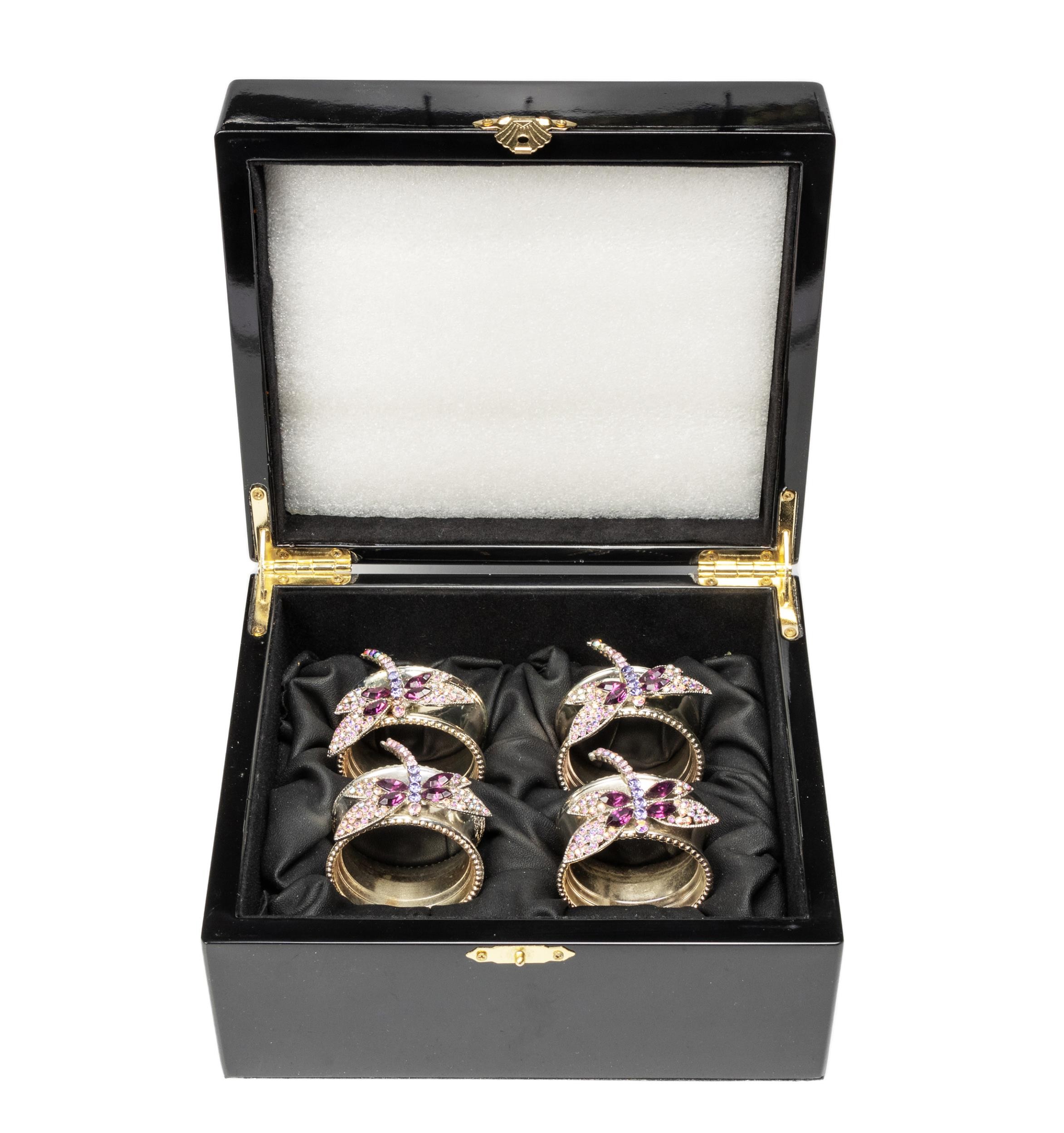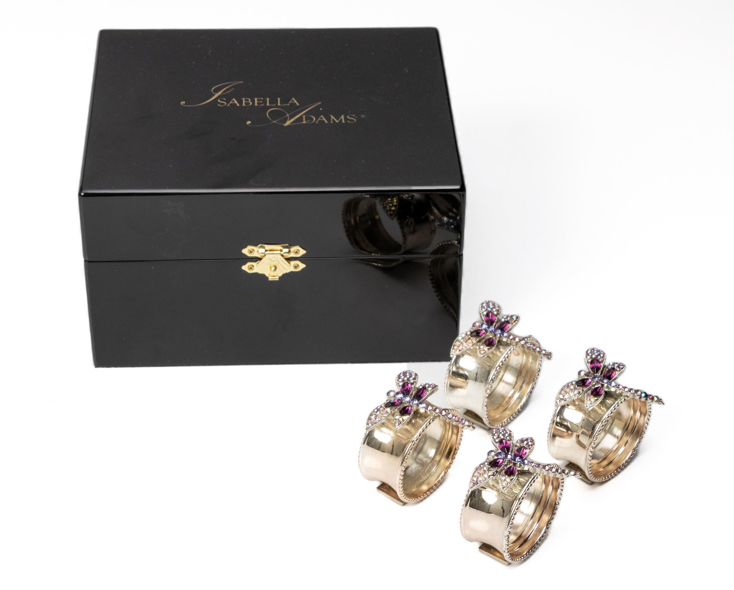 A CASED SET OF FOUR RHODIUM-COATED NAPKIN RINGS, ISABELLA ADAMS