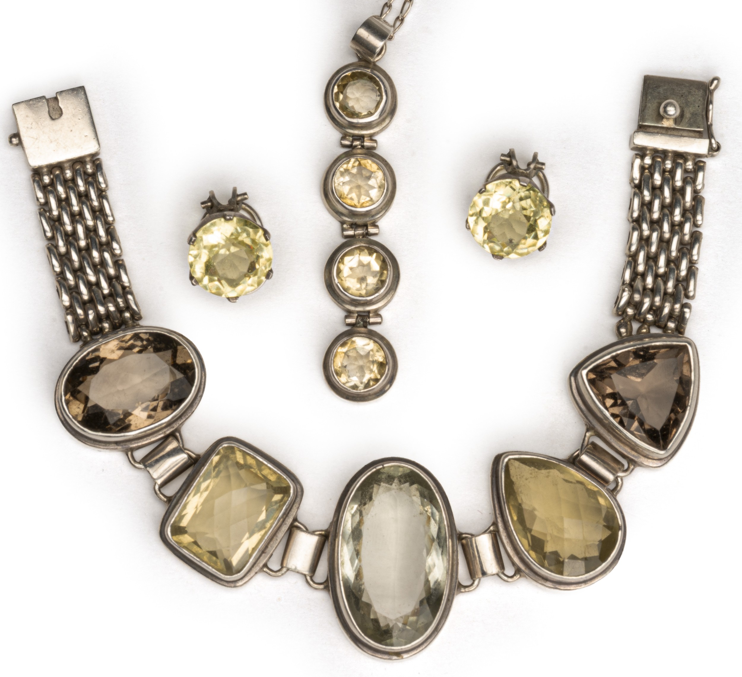 The bracelet bezel set to the centre with alternating gemstones, various cuts with a combined weight of approximately 35 carats, in a silver mesh style bracelet, length 18,5cm, the near matching pendant bezel set with 4 round brilliant cut gemstones, 6cm in length and a pair of claw set gemstone earrings with clip-on fittings, 83g all in