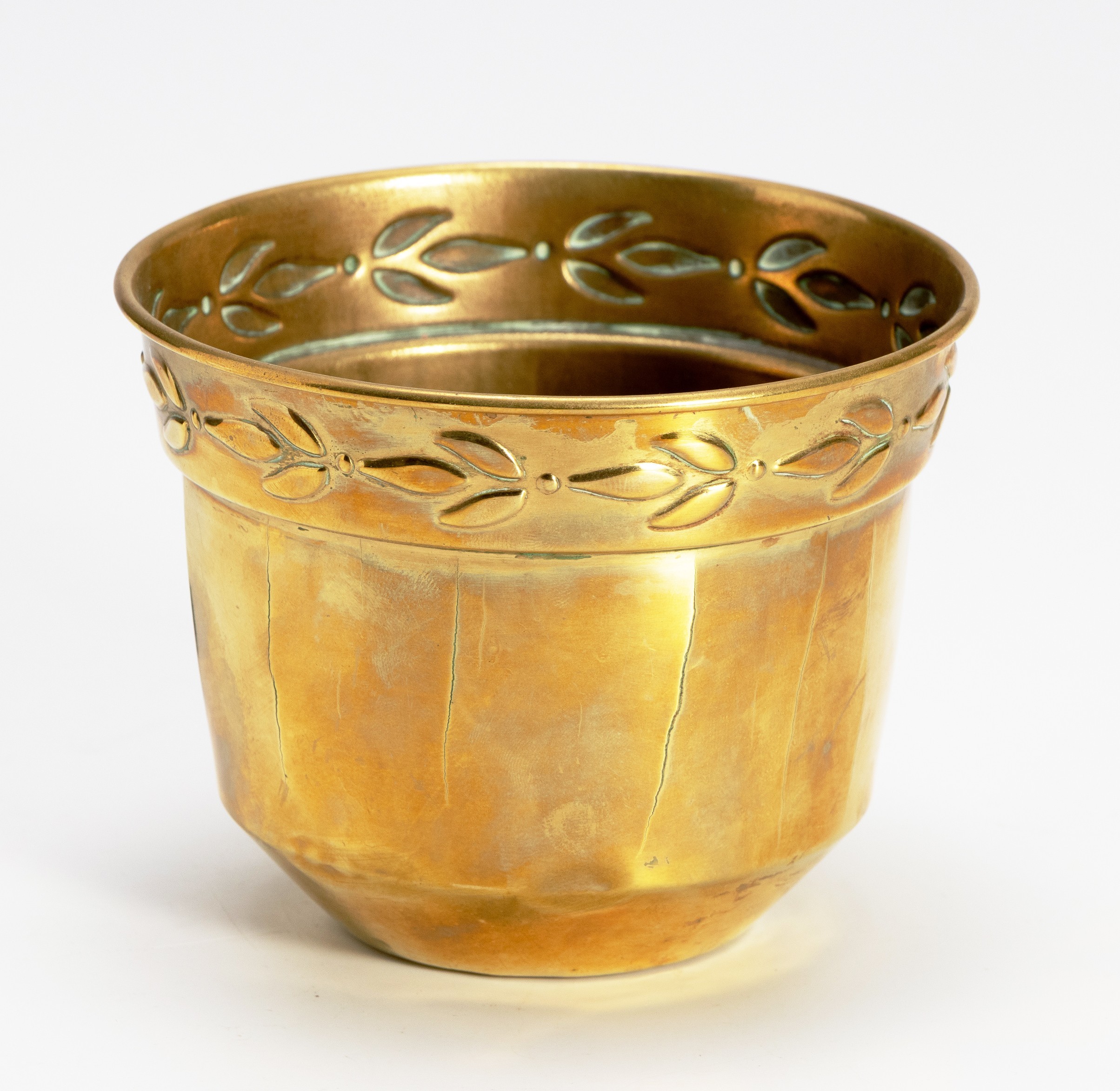 Circular, fold over rim, the border with foliate decoration above a tapering body