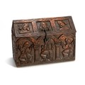 The hinged pitched cover carved with three panels enclosing a portrait of a woman, the body carved with columns and arches enclosing an angel, the sides similarly carved