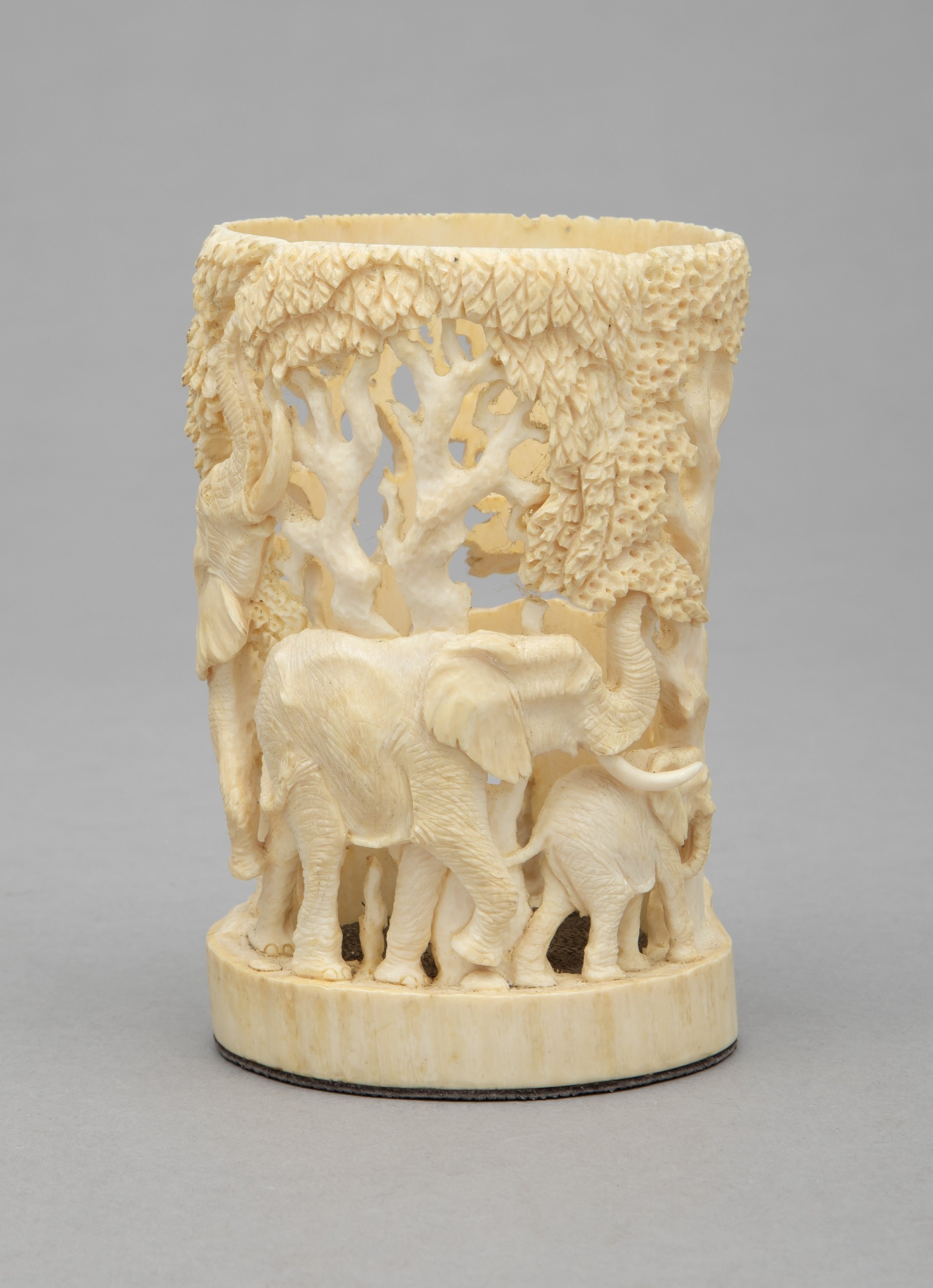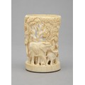 Cylindrical container adorned with intricate three-dimensional carvings of elephant amidst foliage, on a circular base