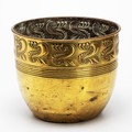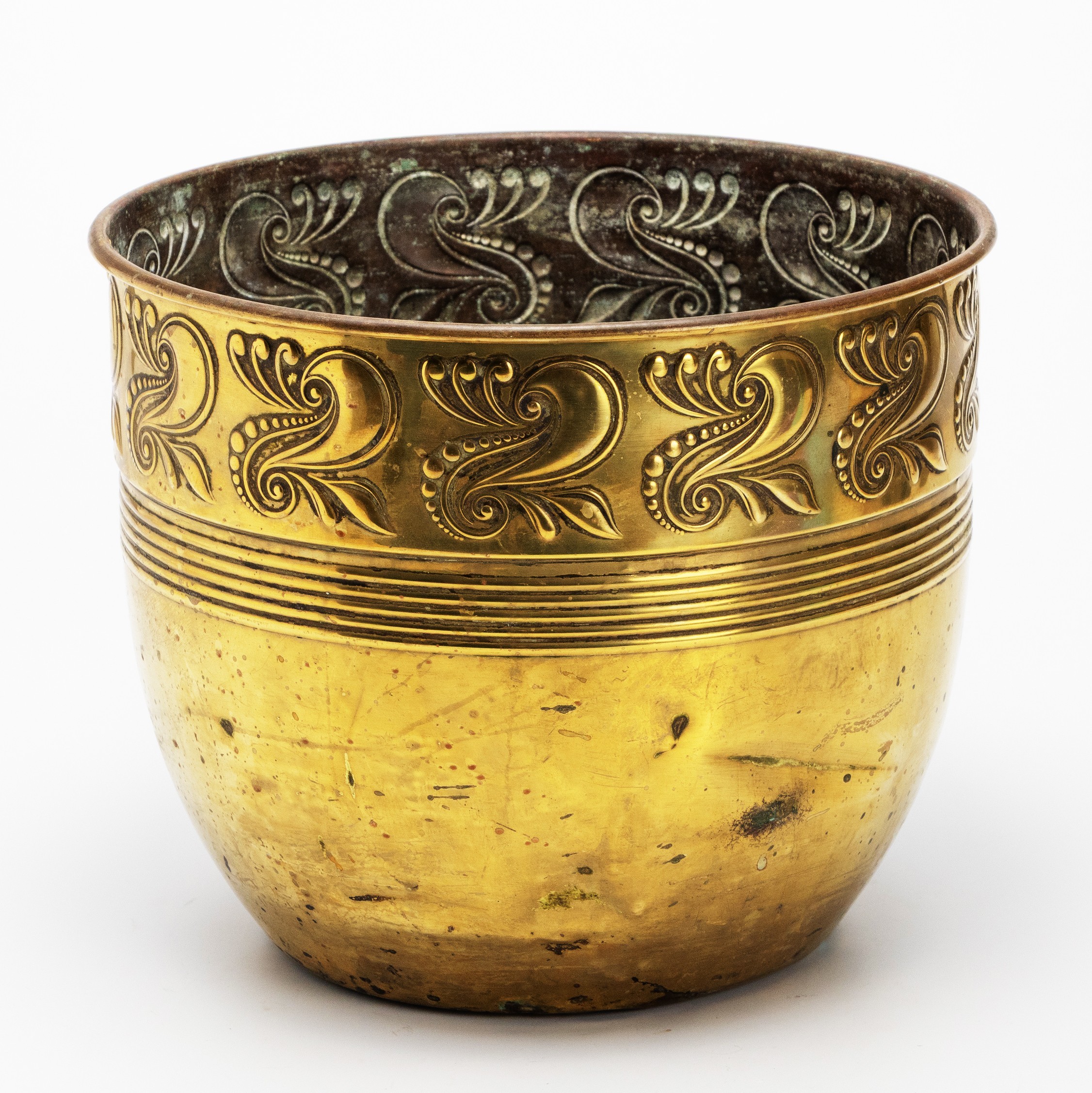 The fold-over rim above embossed scrolls