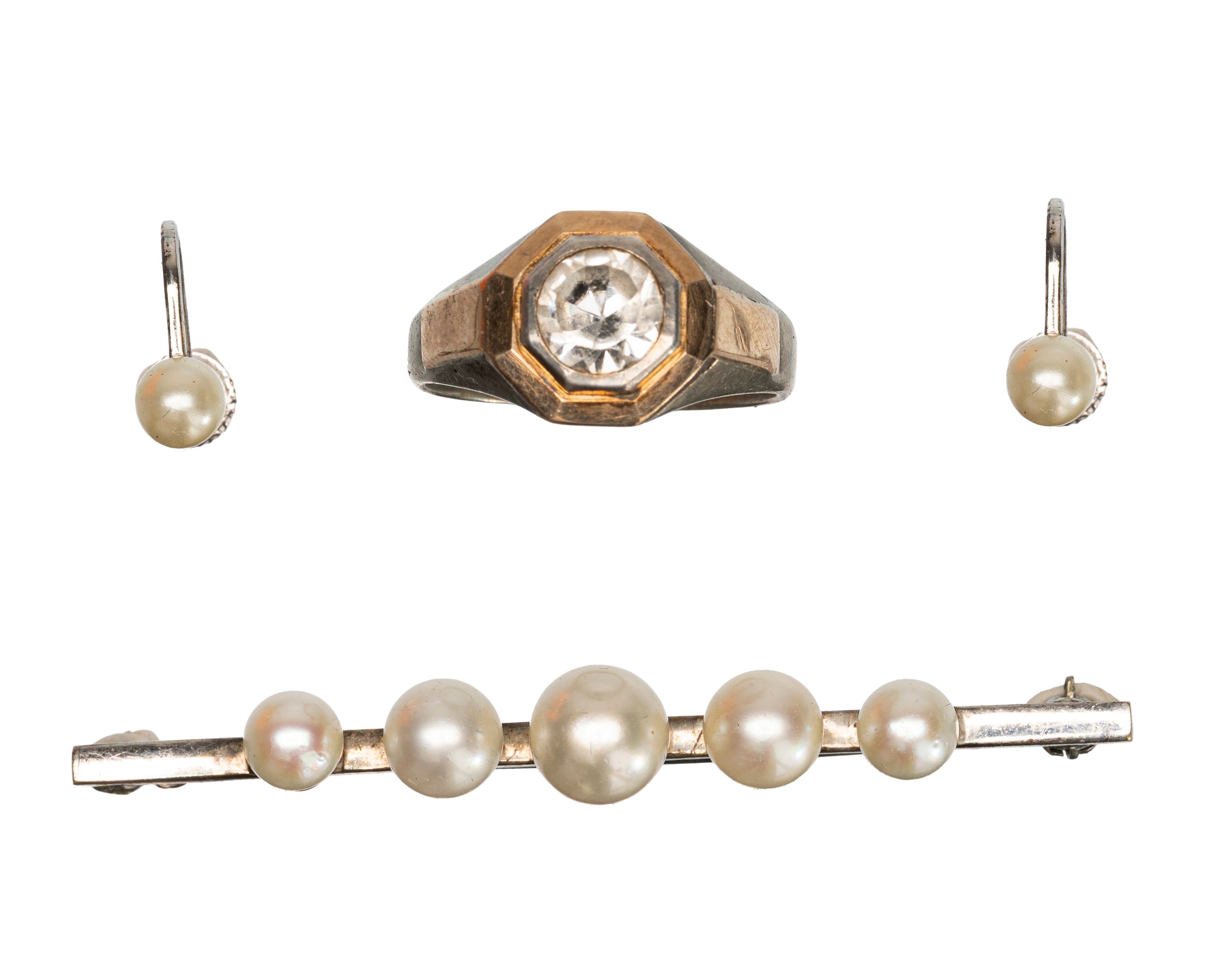 Comprising a pearl brooch, 6cm long, a pair of pearl earrings and a gentleman's silver and 9ct gold ring, size M, bezel set to the centre with a round brilliant-cut Swarovski style crystal, weighing 2.00 carats, 13g all in
