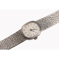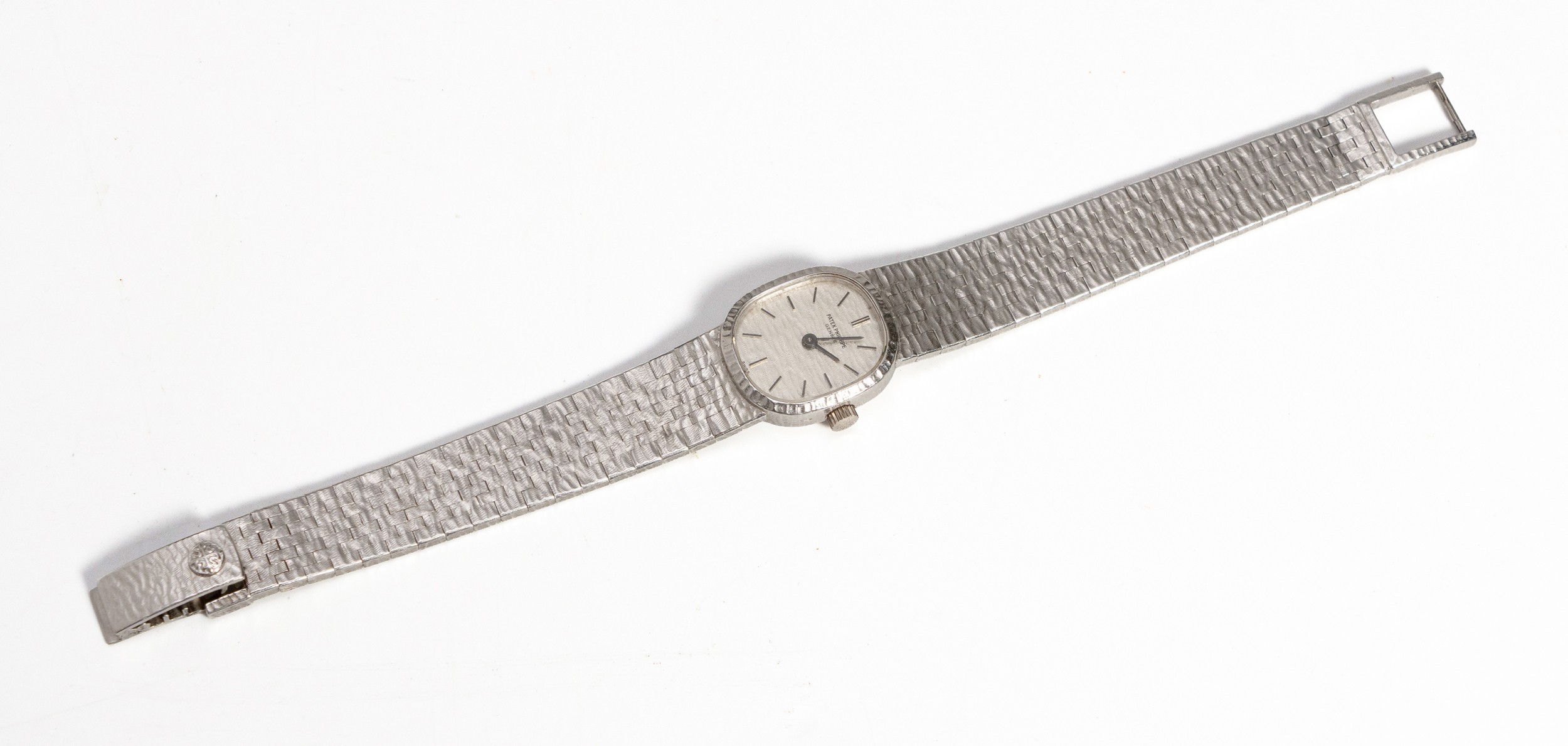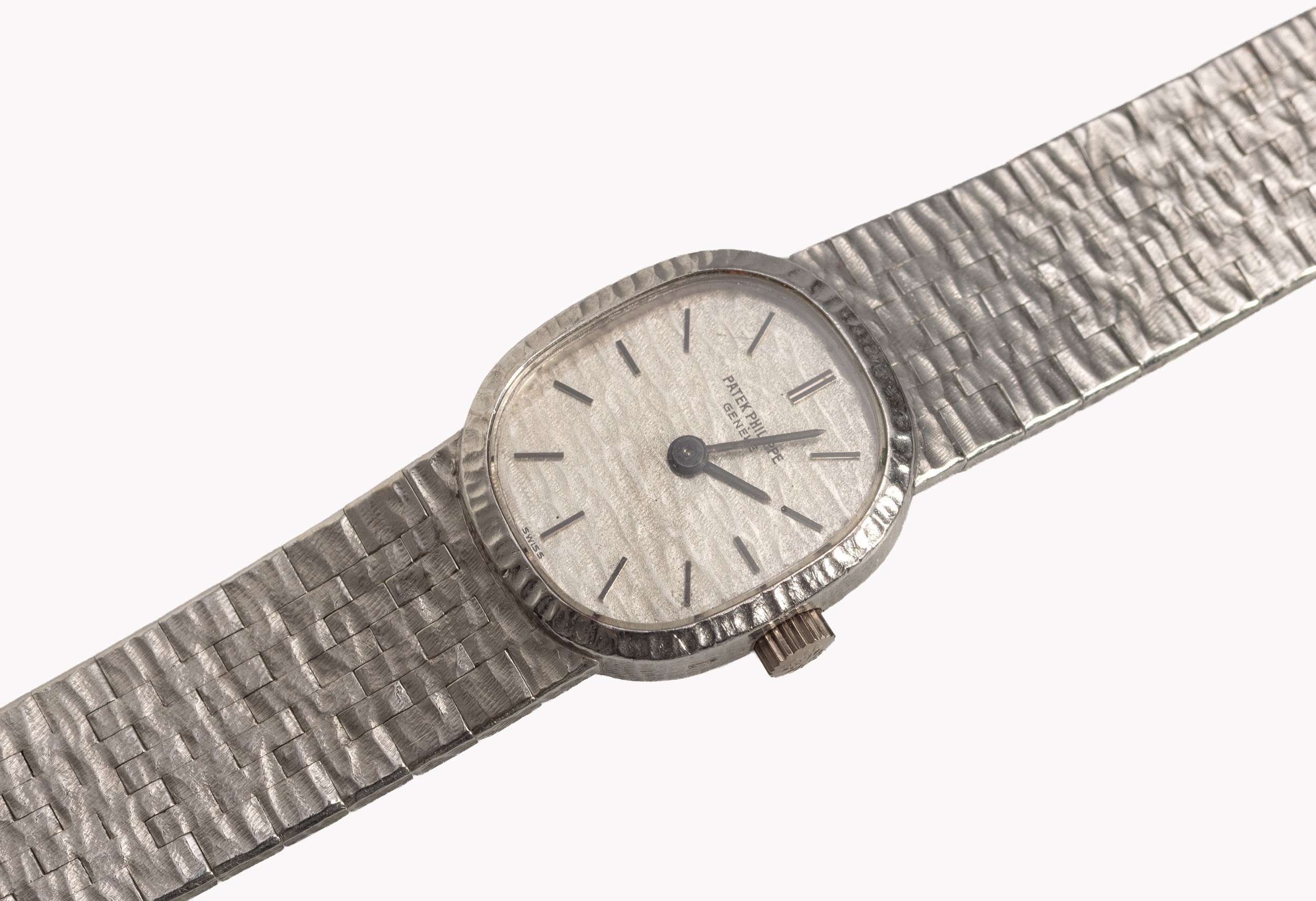 The oval rectangular silvered dial with Batton hour markers, 18ct white gold with an Intergrated 18ct white gold strap, impressed Patek Philippe, Geneve, 750, length of dial 25mm accompanied by a service document Chronos dated 15-12-2014